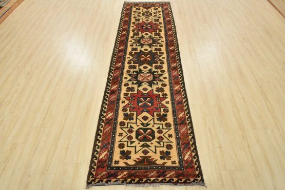 An authentic vintage tribal Baloch runner hand-knotted with fine wool and natural dyes. This nomadic oriental rug features rows of geometric medallions surrounded by geometric motifs set against a beige background. It has a full wool pile with no worn areas and is in very good condition.