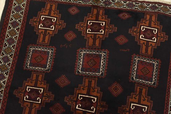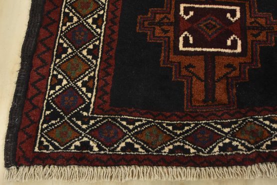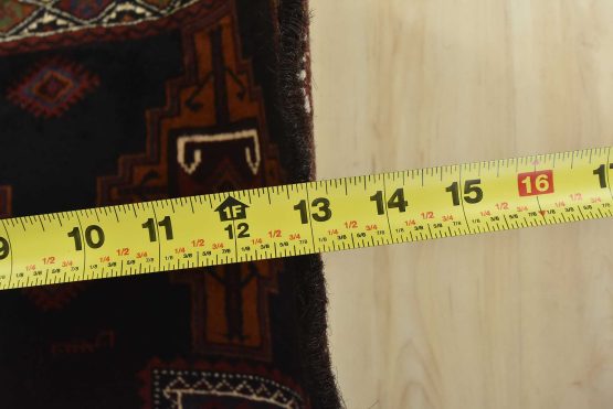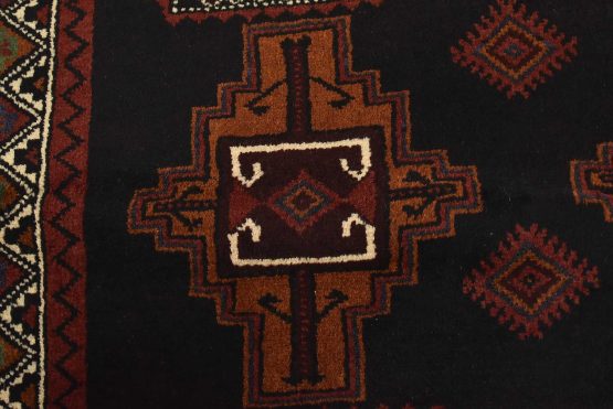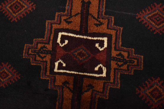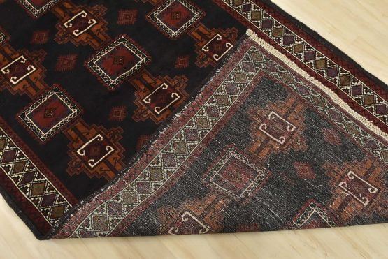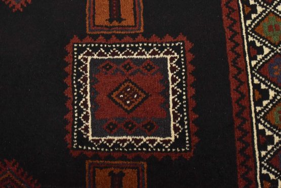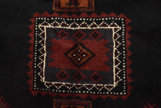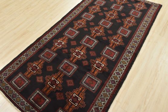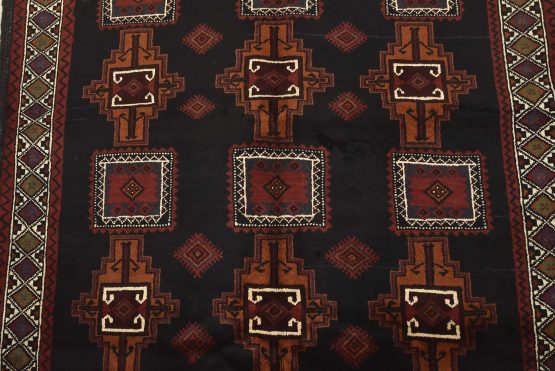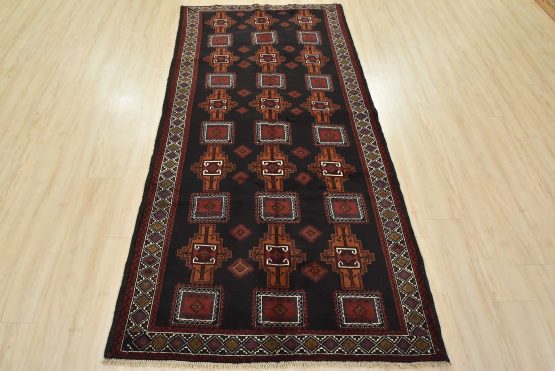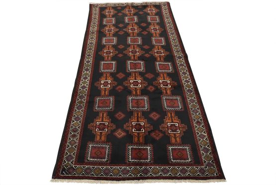 An authentic vintage tribal Baloch runner hand-knotted with fine wool and natural dyes. This nomadic oriental rug features rows of geometric motifs set against a black background. It has a full wool pile with no worn areas and is in very good condition.