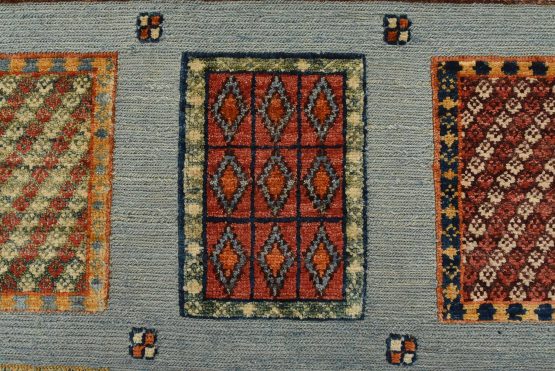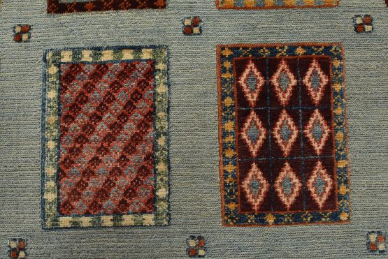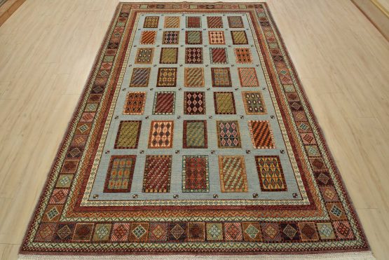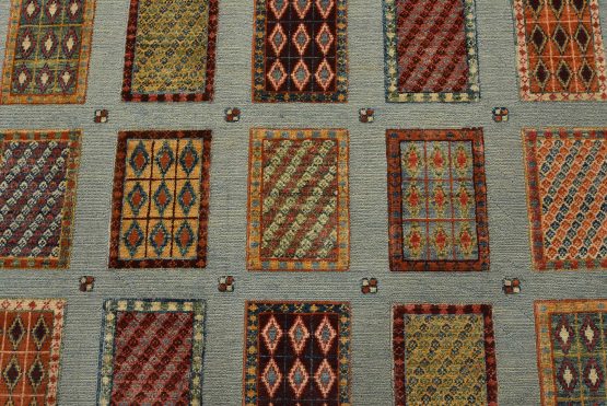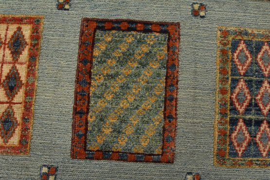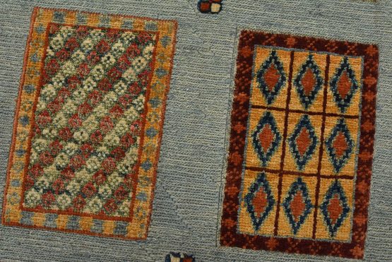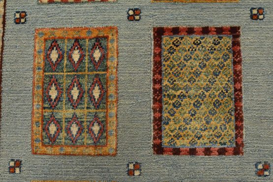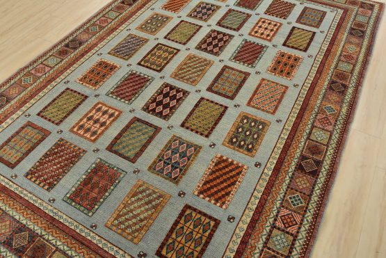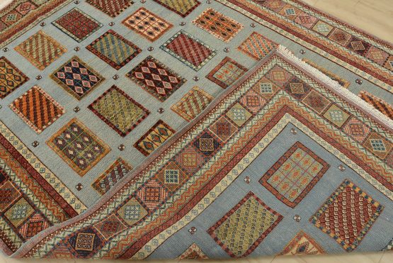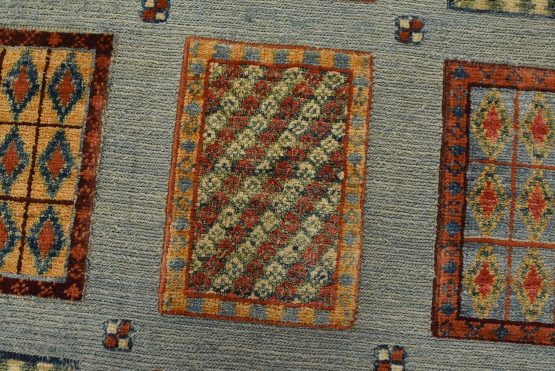 A tribal Barjasta rug hand-knotted with an all-wool pile on a cotton foundation. This oriental rug features a geometric panel design woven atop a flat-woven foundation, creating varying pile heights set against a light blue background. It is new and in excellent condition.