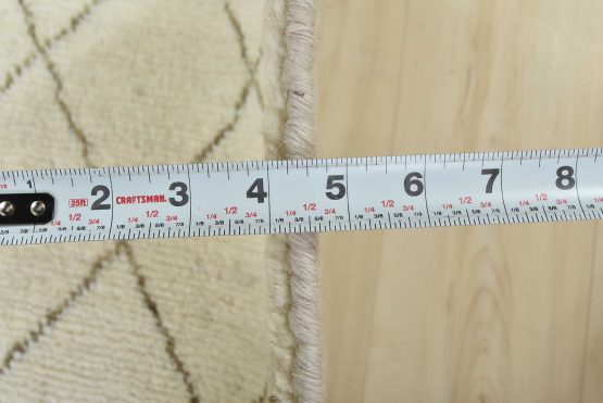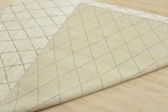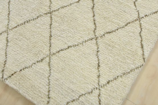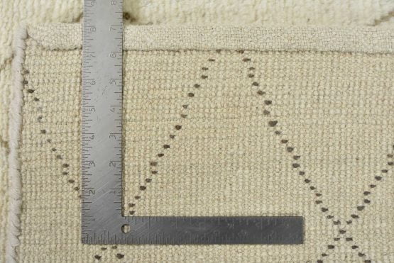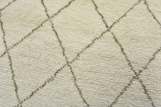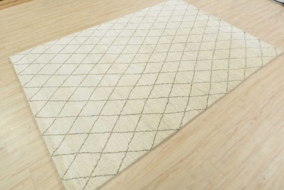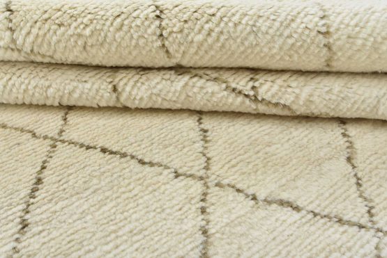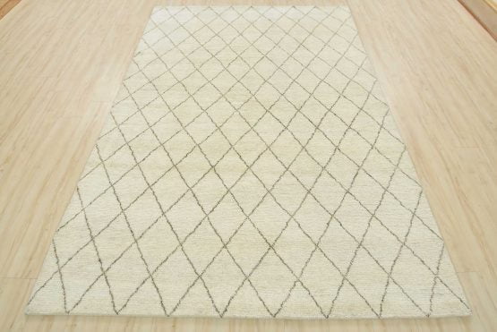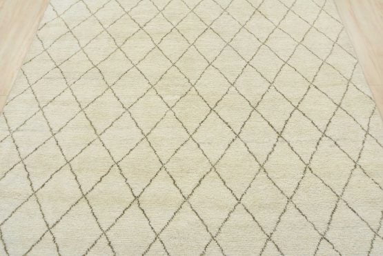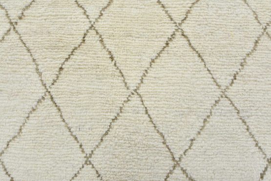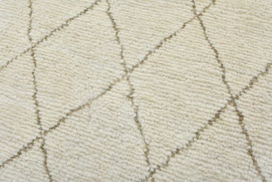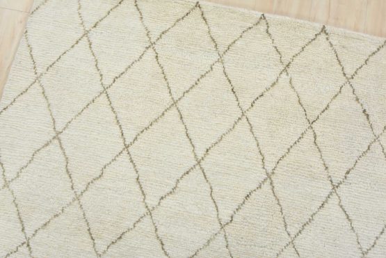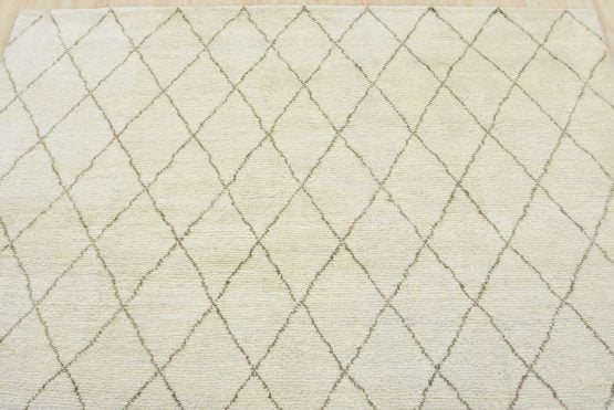 A contemporary Moroccan rug hand-knotted with an all-wool pile on a cotton foundation. This area rug features an all-over geometric pattern set against an ivory background. It is new and in excellent condition.