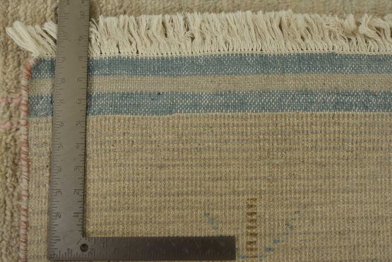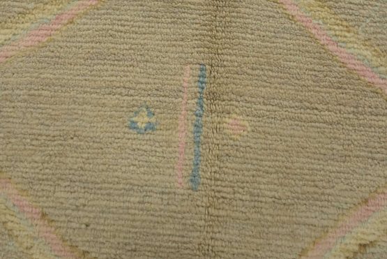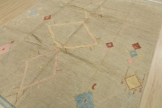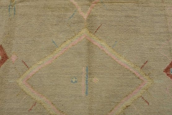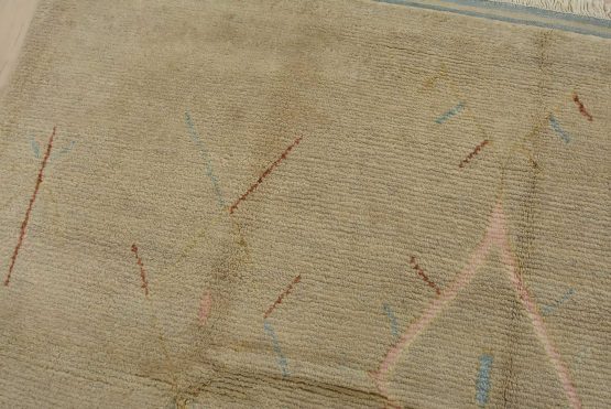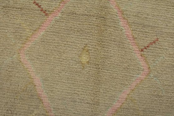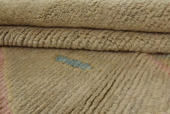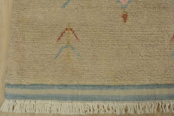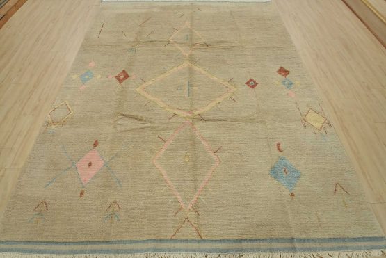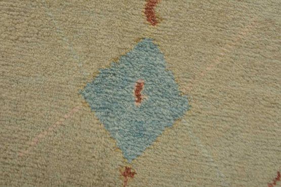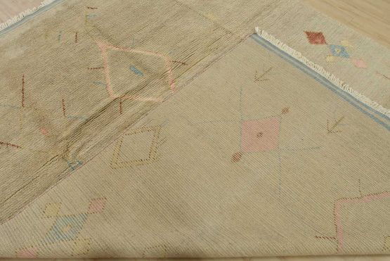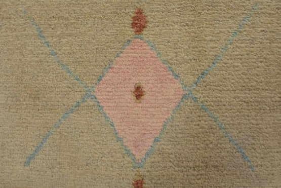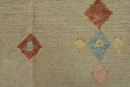 A contemporary Moroccan rug hand-knotted with an all-wool pile on a cotton foundation. This area rug features diamond-shaped medallions surrounded by geometric motifs set against a beige background. It is new and in excellent condition.