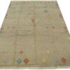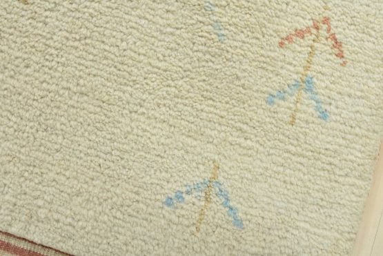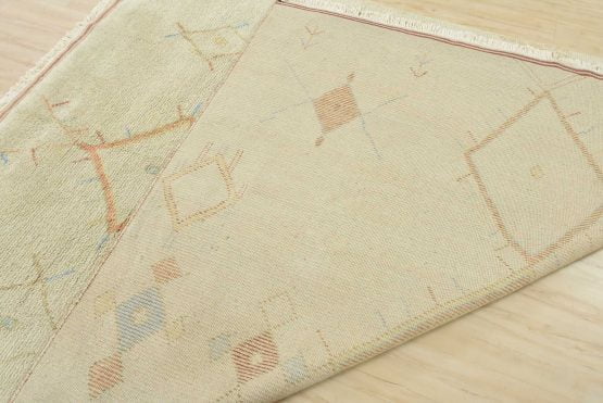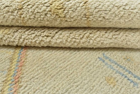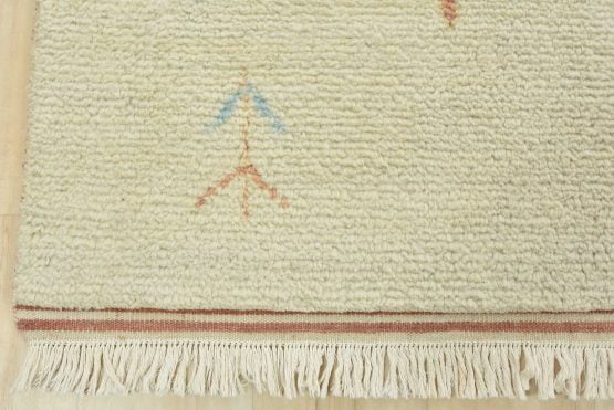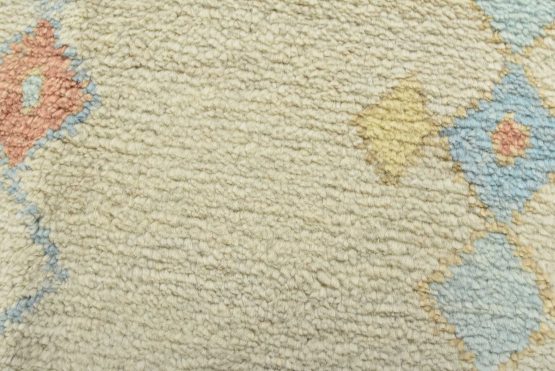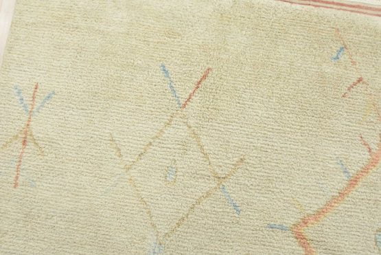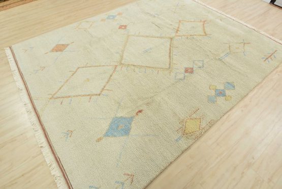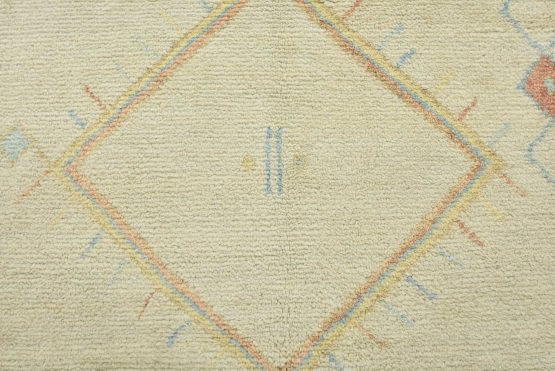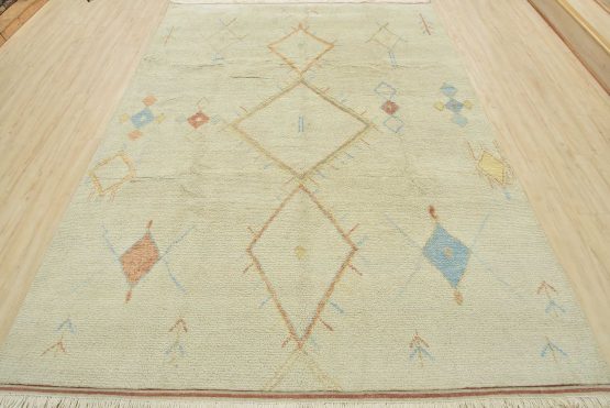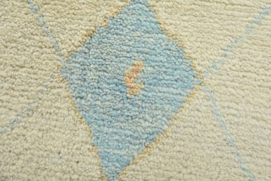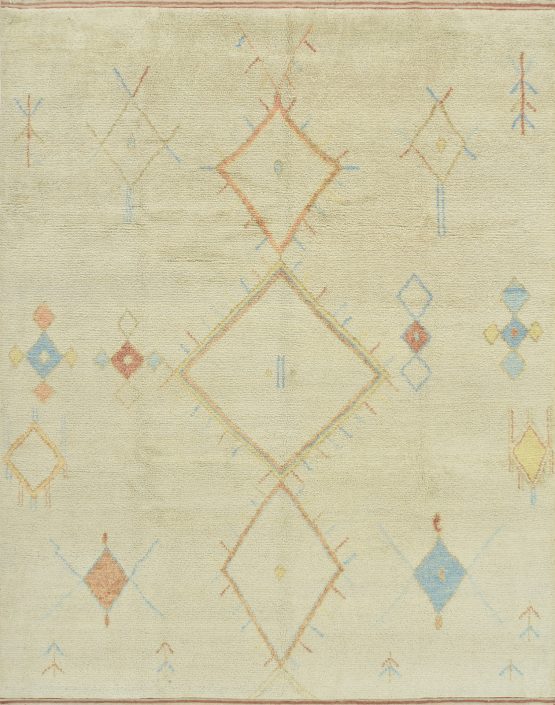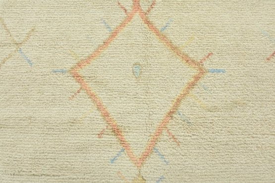A contemporary Moroccan rug hand-knotted with an all-wool pile on a cotton foundation. This area rug features diamond-shaped medallions surrounded by geometric motifs set against an ivory-colored background. It is new and in excellent condition.