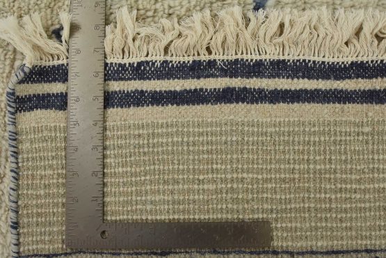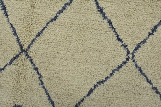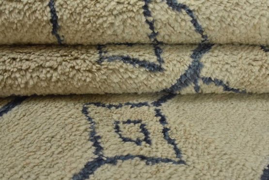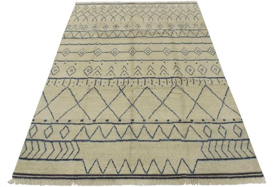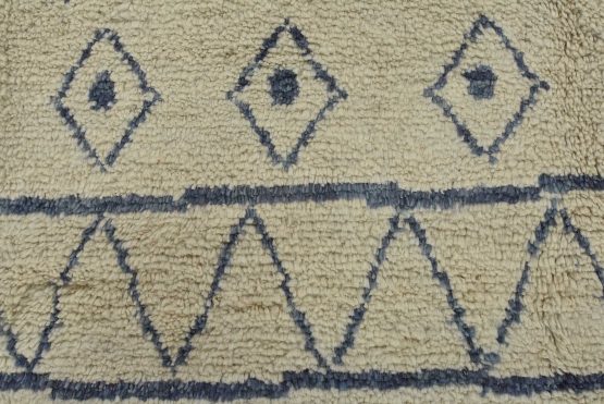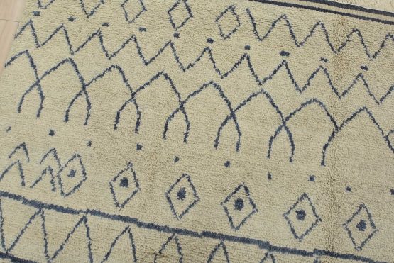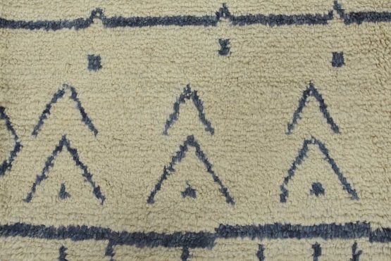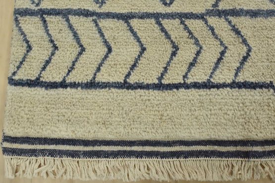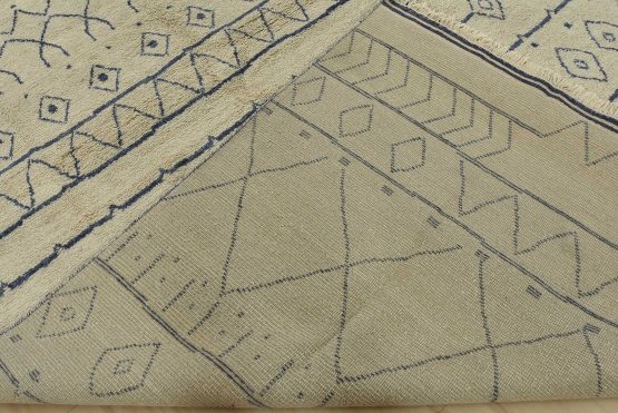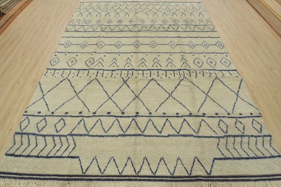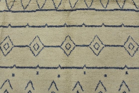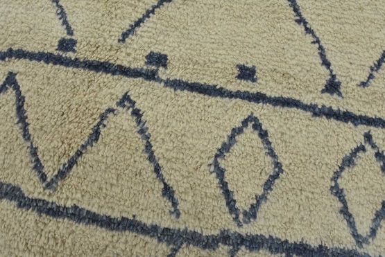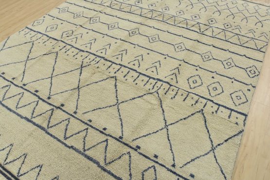 A contemporary Moroccan rug hand-knotted with an all-wool pile on a cotton foundation. This oriental rug features geometric patterns set against an ivory background. It is new and in excellent condition.