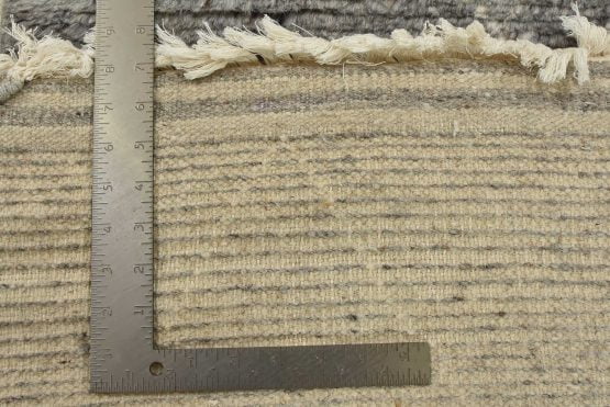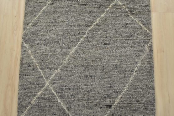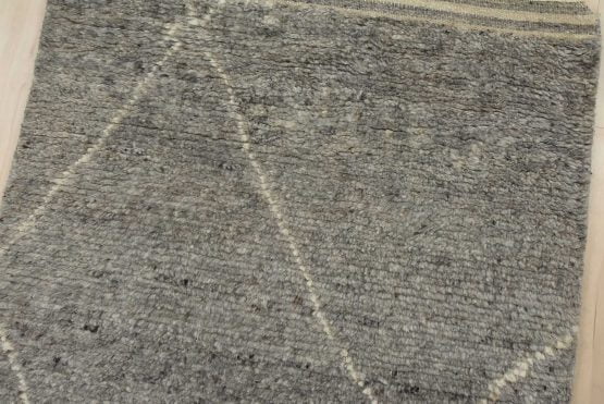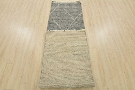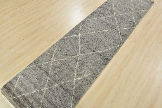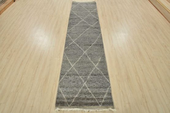 A contemporary Moroccan runner hand-knotted with an all-wool pile on a cotton foundation. This rug features a geometric pattern set against a gray background. It is new and in excellent condition.