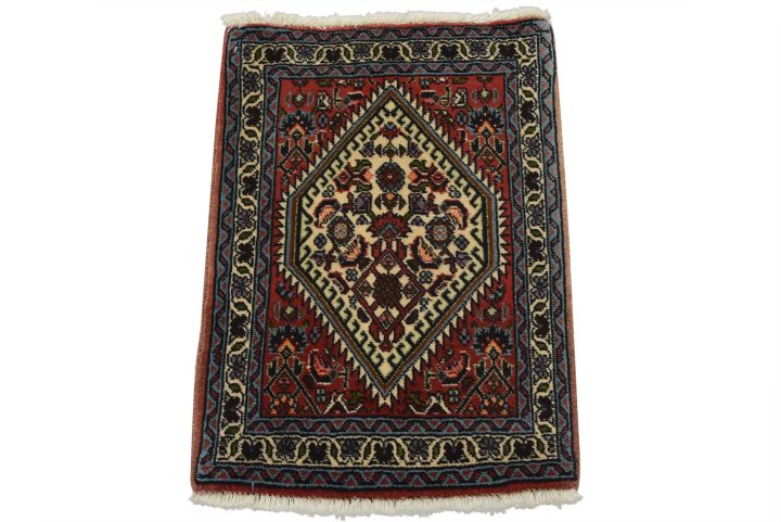 An authentic vintage traditional tribal Bidjar rug hand-knotted with fine wool and natural dyes. This finely woven oriental rug features a geometric medallion set against a red background. It has a full wool pile with no worn areas and is in very good condition.