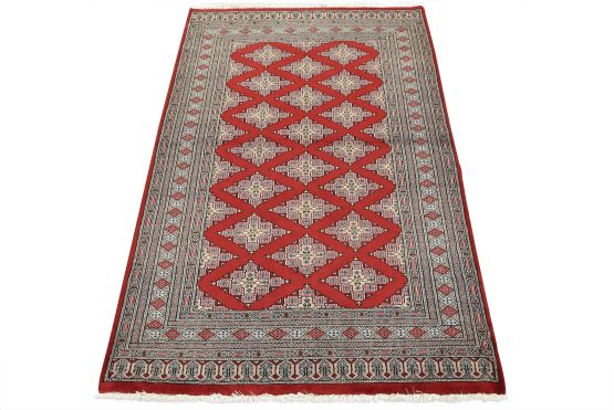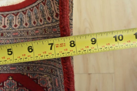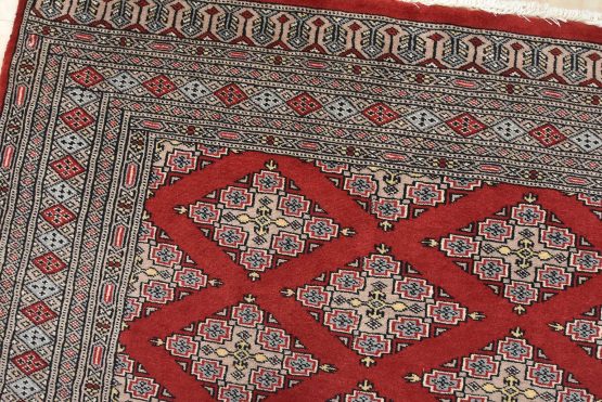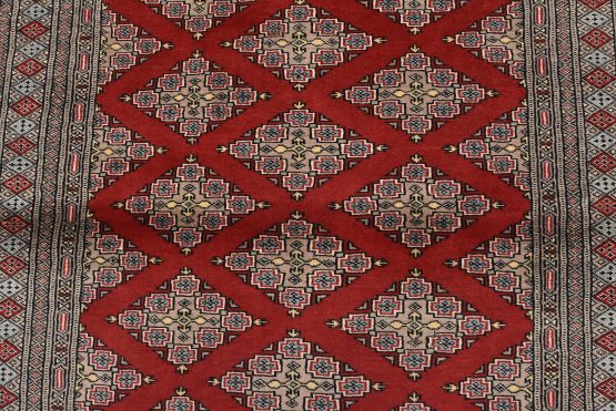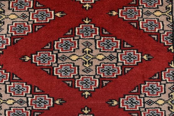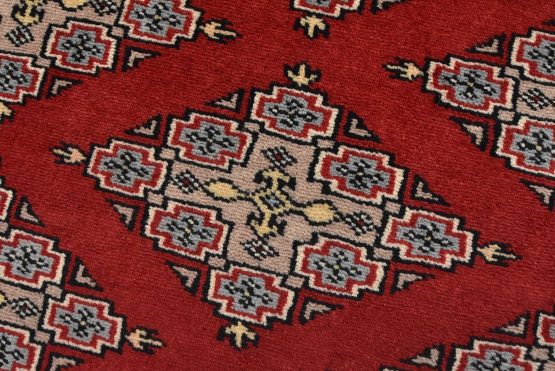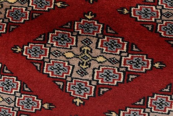 A tribal Bokhara Jaldar rug hand-knotted with an all-wool pile on a cotton foundation. This finely woven oriental rug features rows of repeating geometric medallions set against a red background. It is new and in excellent condition.