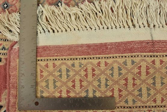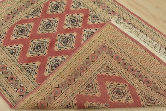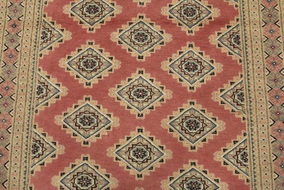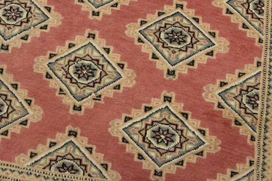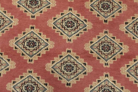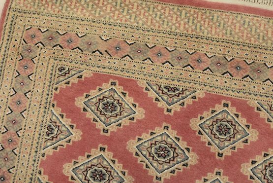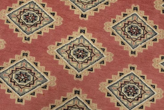 A tribal Bokhara Jaldar rug hand-knotted with an all-wool pile on a cotton foundation. This finely woven oriental rug features rows of repeating geometric medallions set against a pink background. It is new and in excellent condition.