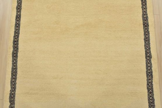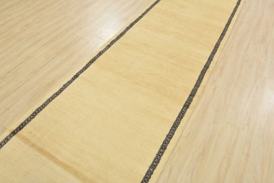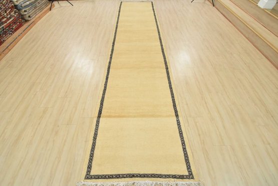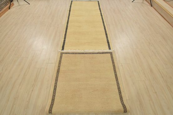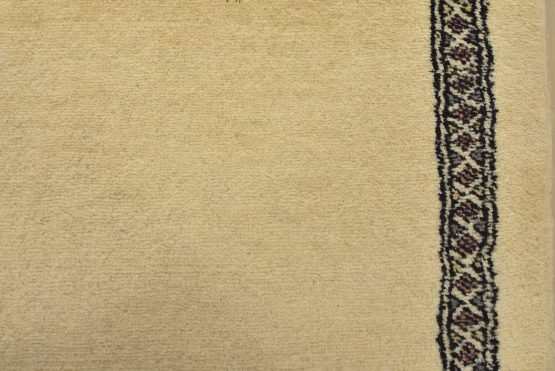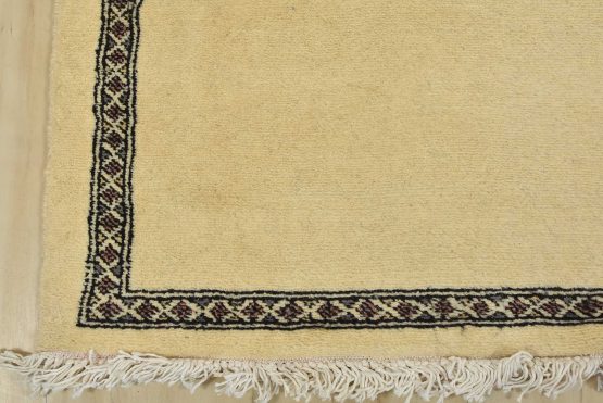 A tribal Bokhara runner hand-knotted with an all-wool pile on a cotton foundation. This finely woven oriental rug features a solid beige background framed by a border with a geometric pattern. It is new and in excellent condition.