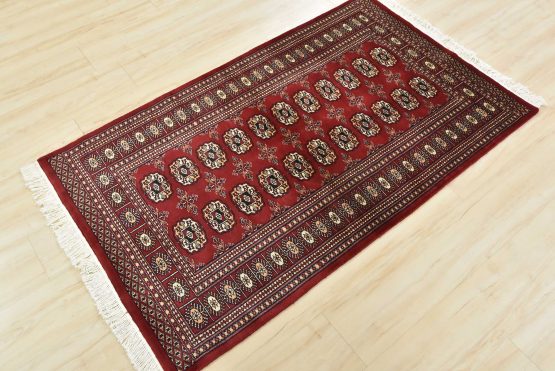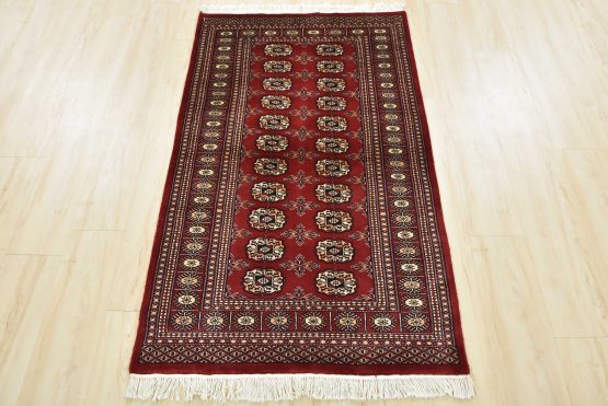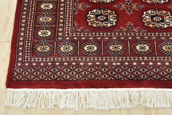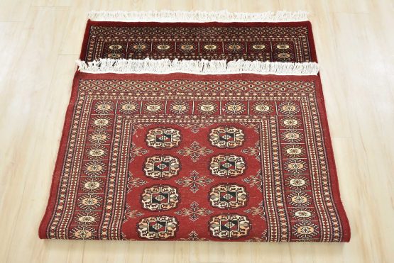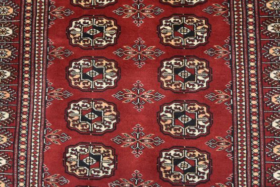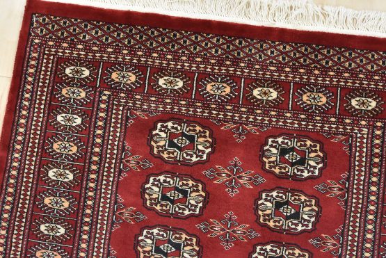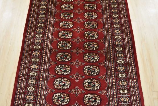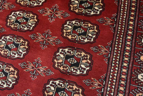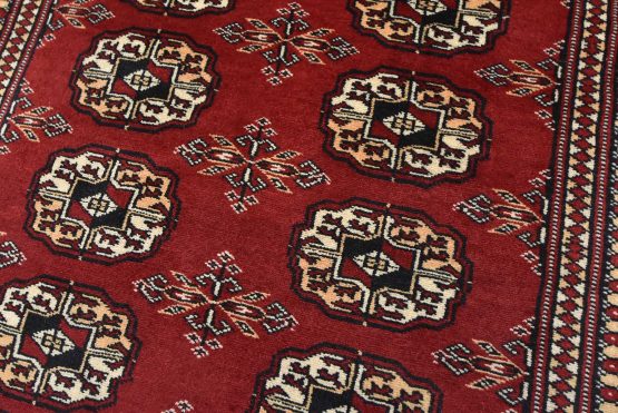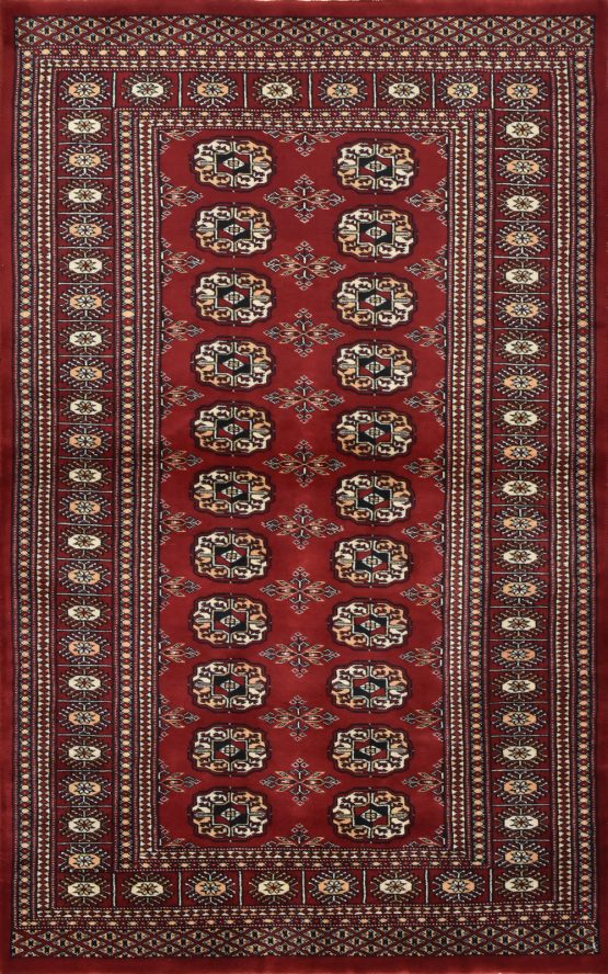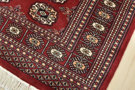 Bokhara rugs have small, repeating geometric designs woven with fine wool. The most common Bokhara design consists of rows of “Tekke” guls or medallions (the Tekkes were one of the Turkmen tribes). Bokhara rugs are made in Pakistan, Turkey, Uzbekistan, and Afghanistan.