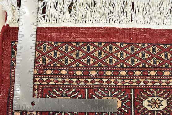 A tribal Bokhara rug hand-knotted with an all-wool pile on a cotton foundation. This finely woven oriental rug features rows of small repeating geometric medallions set against a red background. It is new and in excellent condition.