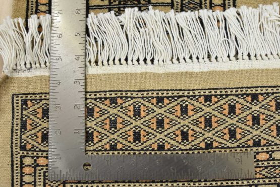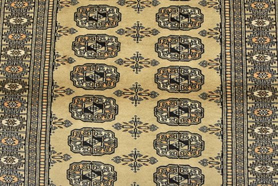A tribal Bokhara rug hand-knotted with an all-wool pile on a cotton foundation. This finely woven oriental rug features rows of repeating medallions set against a beige background. It is new and in excellent condition.