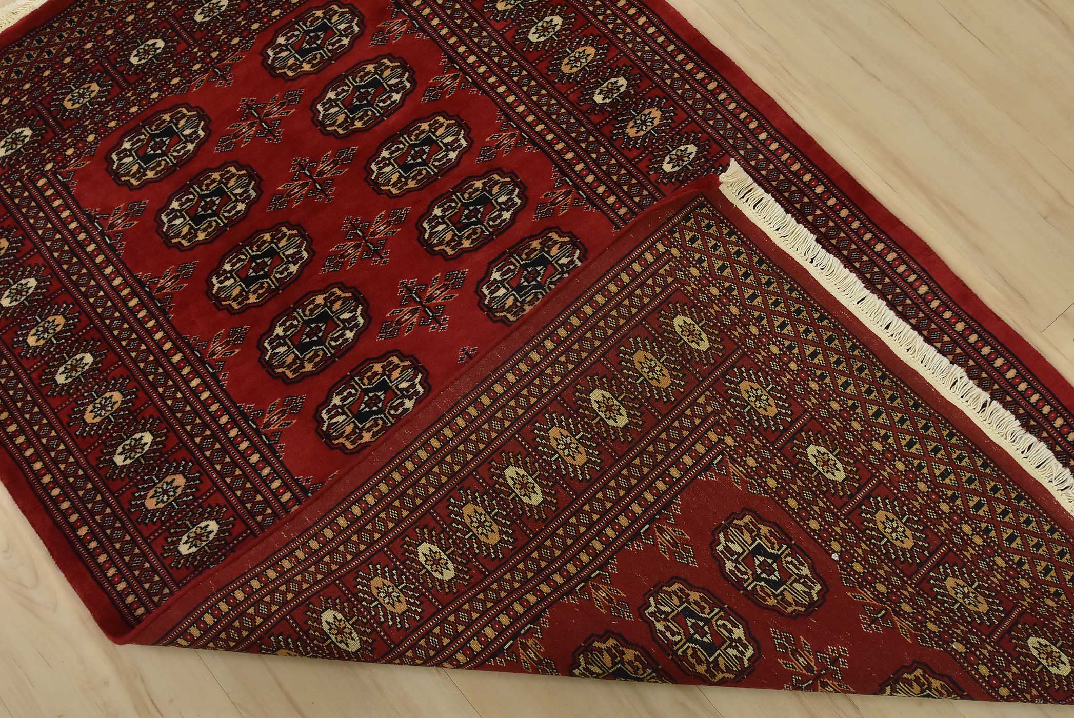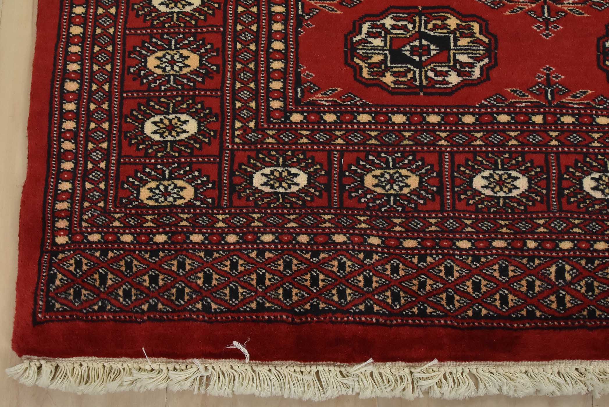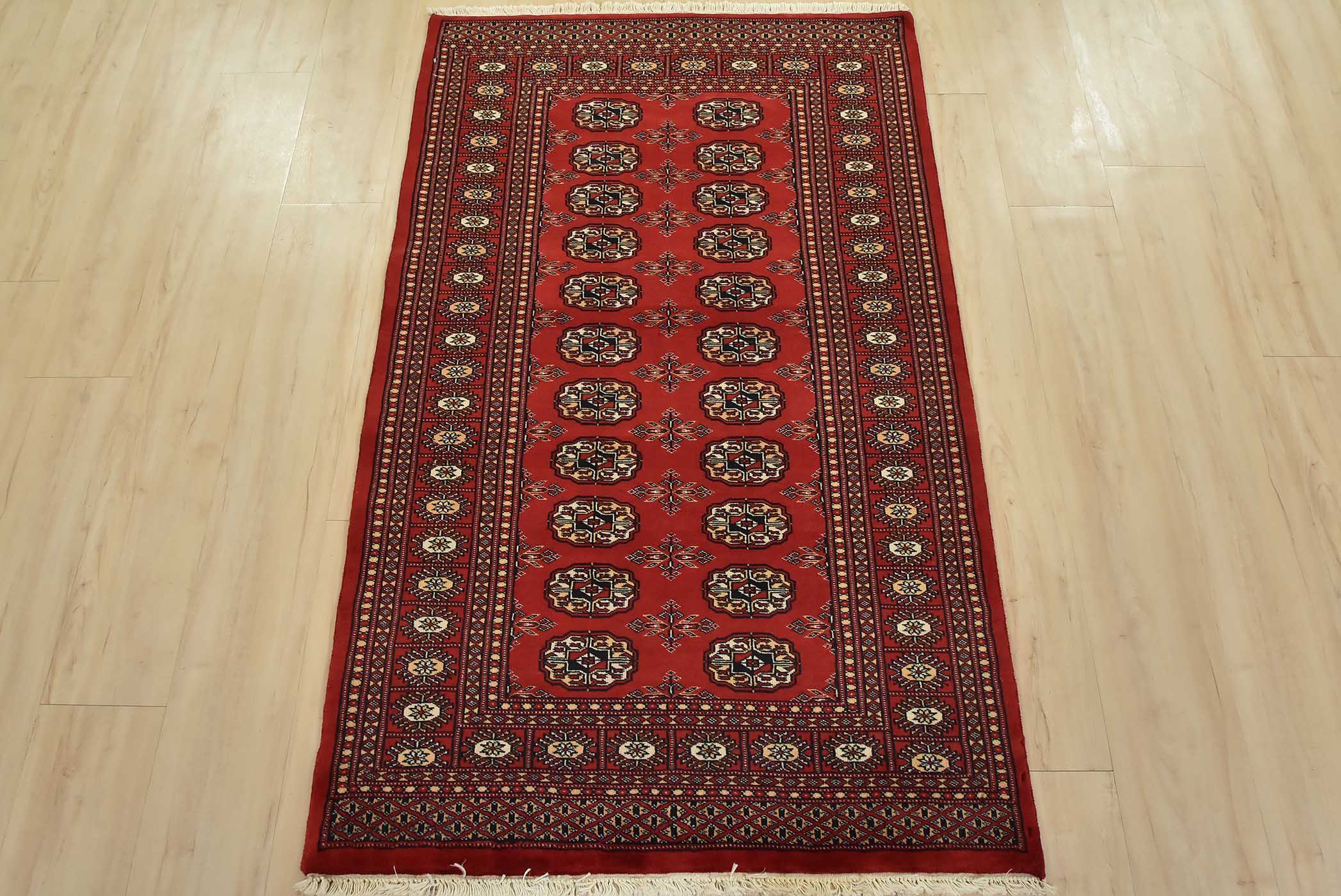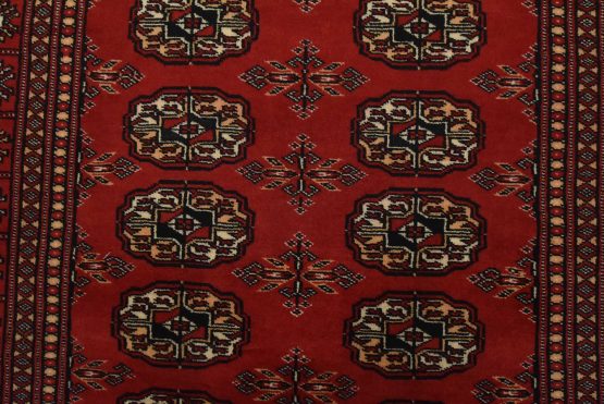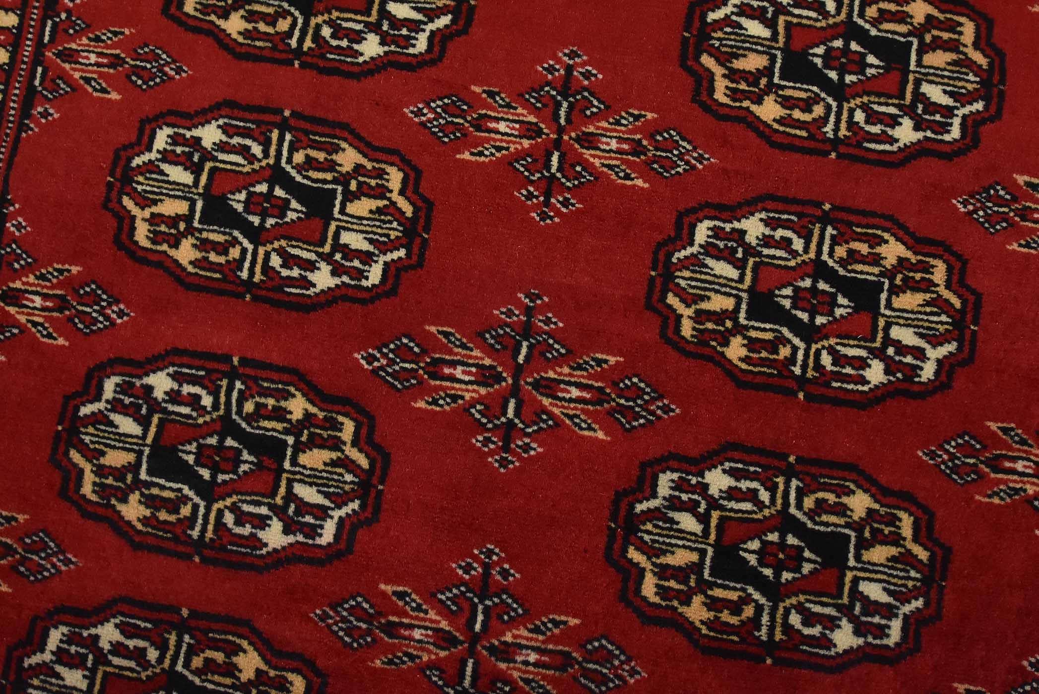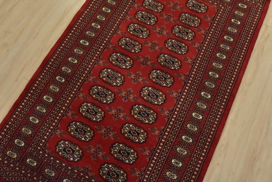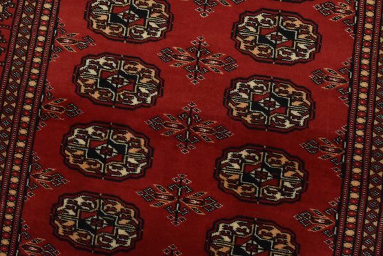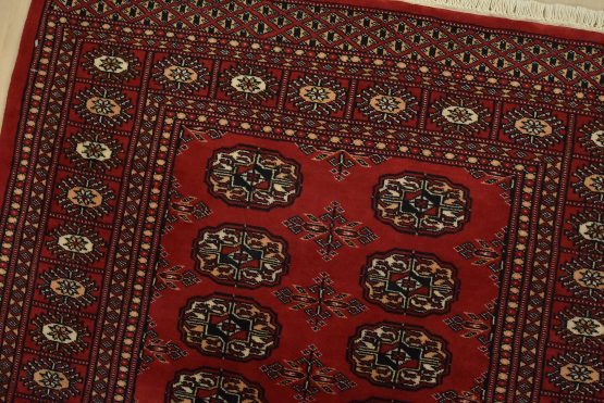 Bokhara rugs have small, repeating geometric designs woven with fine wool. The most common Bokhara design consists of rows of “Tekke” guls or medallions (the Tekkes were one of the Turkmen tribes). Bokhara rugs are made in Pakistan, Turkey, Uzbekistan, and Afghanistan.