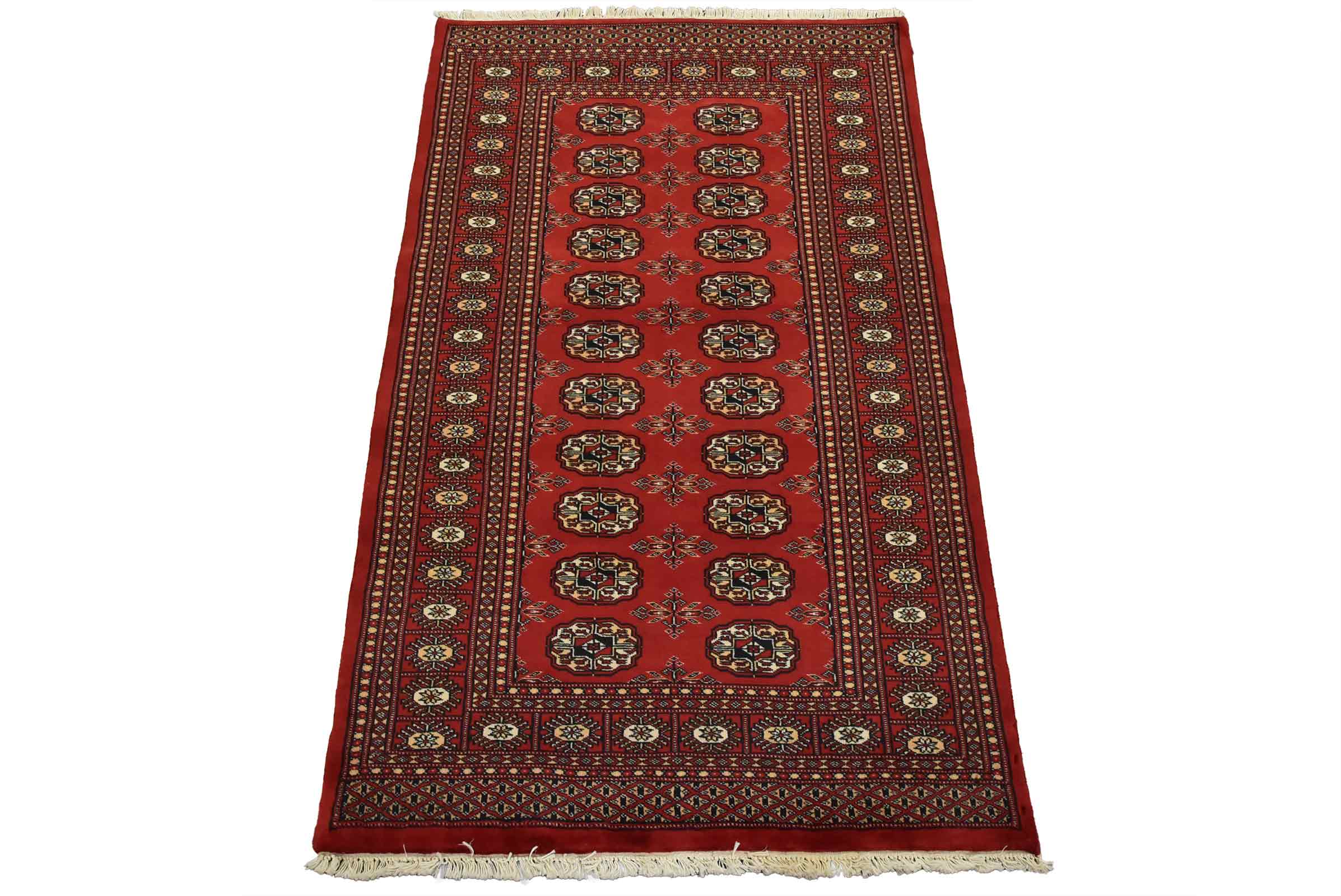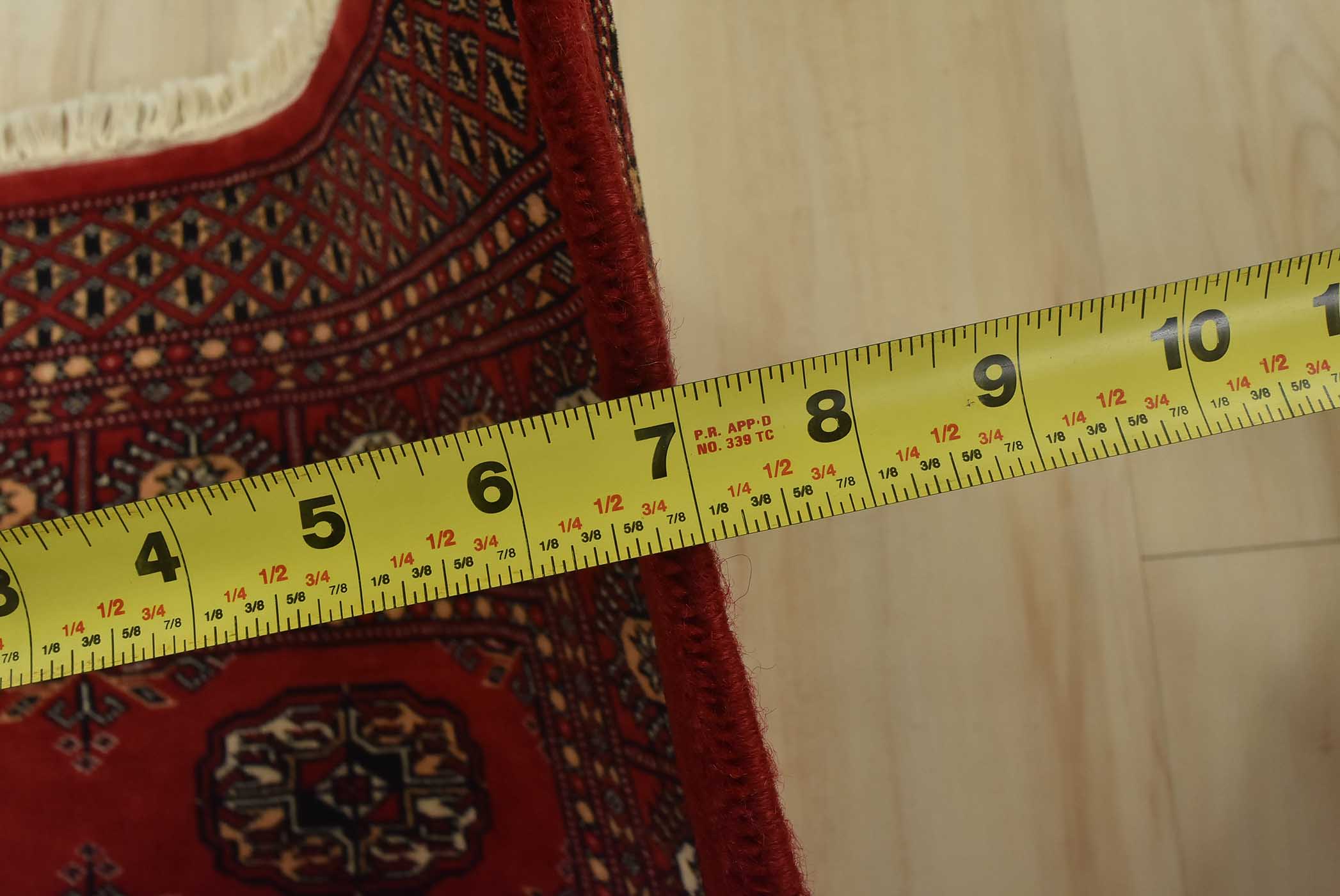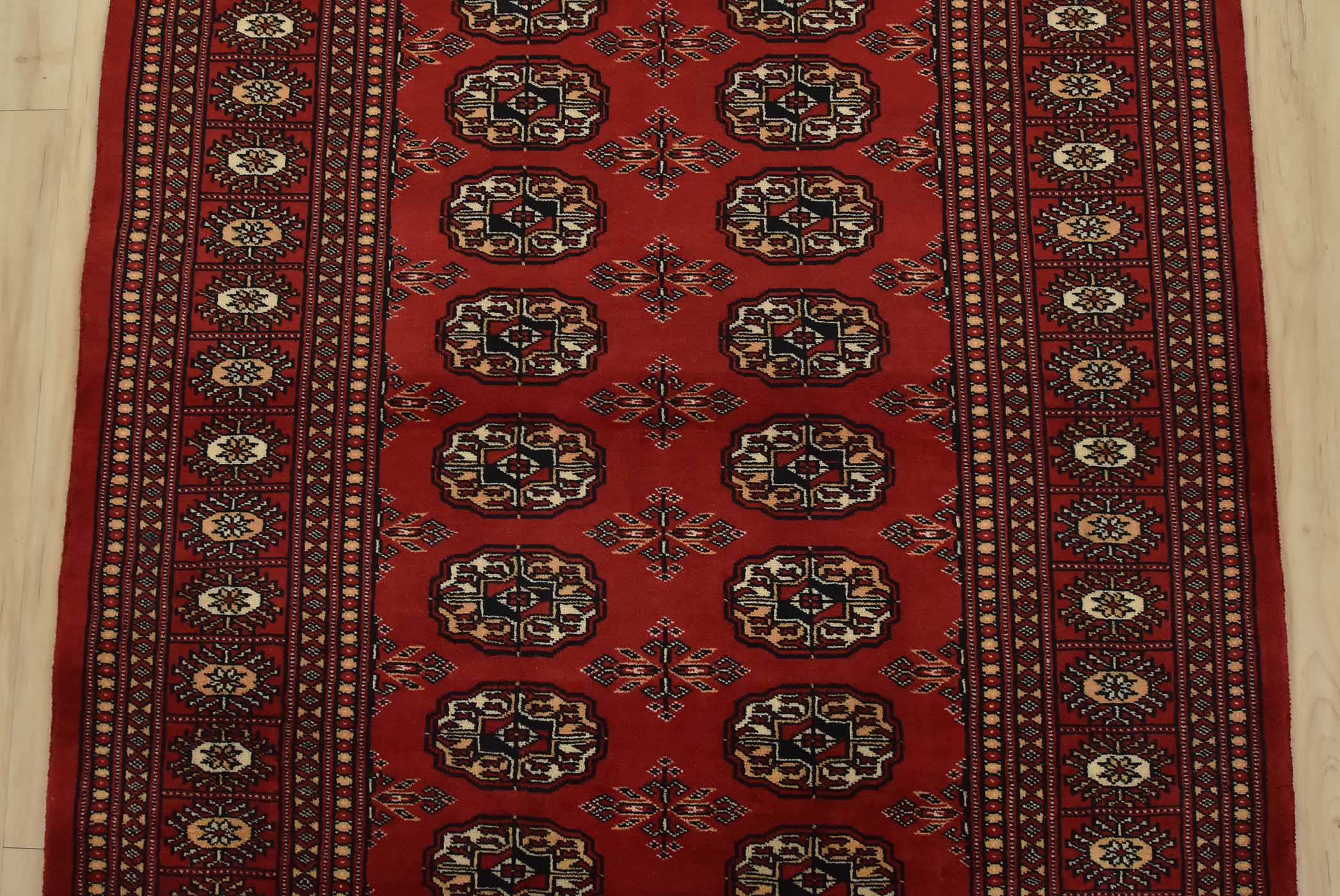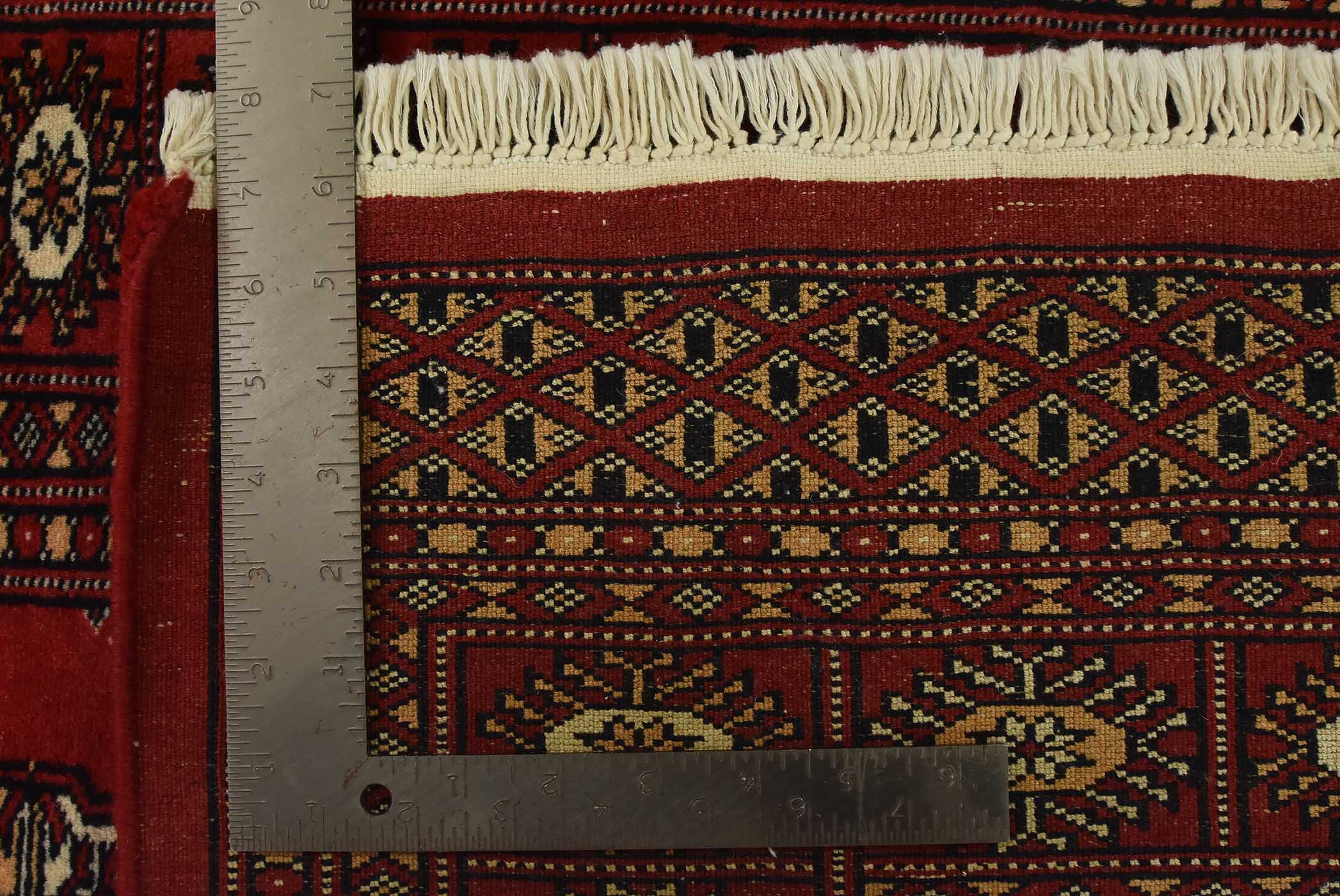 Bokhara rugs have small, repeating geometric designs woven with fine wool. The most common Bokhara design consists of rows of “Tekke” guls or medallions (the Tekkes were one of the Turkmen tribes). Bokhara rugs are made in Pakistan, Turkey, Uzbekistan, and Afghanistan.