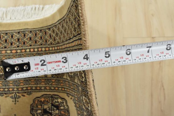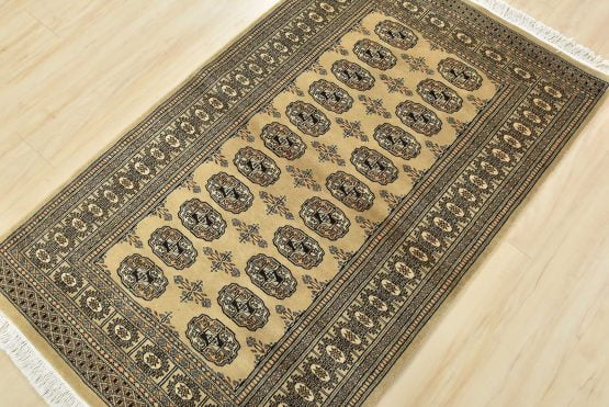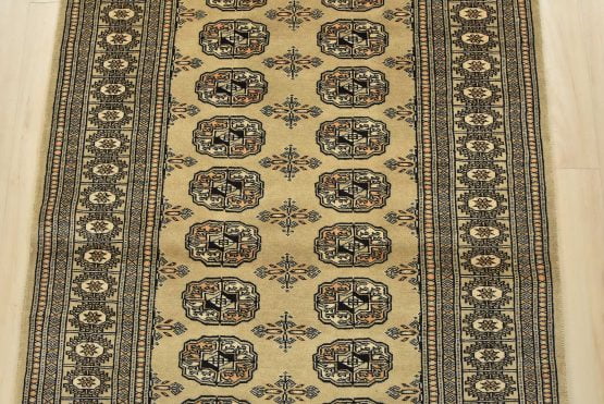 A tribal Bokhara rug hand-knotted with an all-wool pile on a cotton foundation. This finely woven oriental rug features rows of repeating geometric medallions set against a beige background. It is new and in excellent condition.