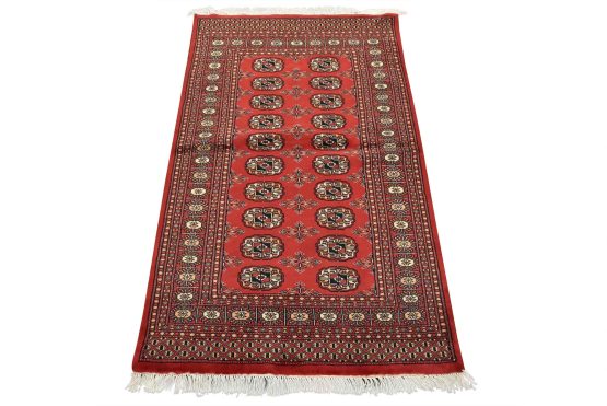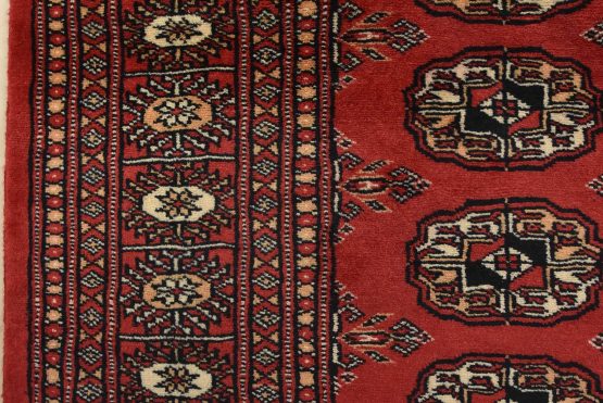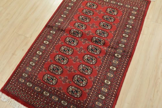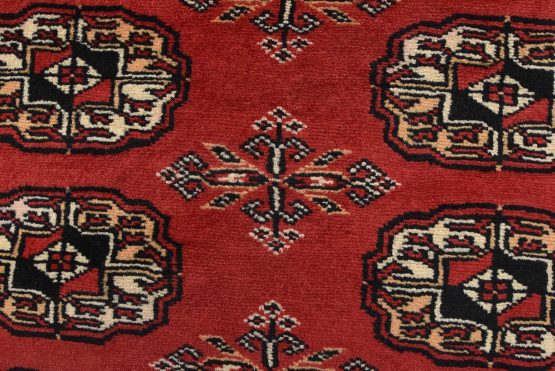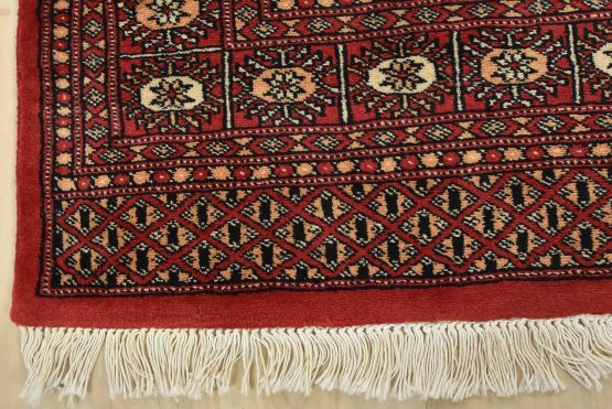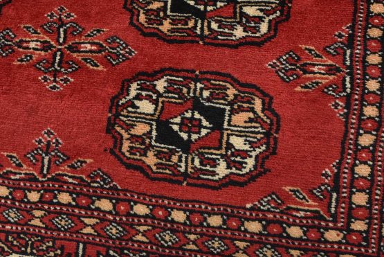 Bokhara rugs have small, repeating geometric designs woven with fine wool. The most common Bokhara design consists of rows of “Tekke” guls or medallions (the Tekkes were one of the Turkmen tribes). Bokhara rugs are made in Pakistan, Turkey, Uzbekistan, and Afghanistan.