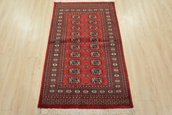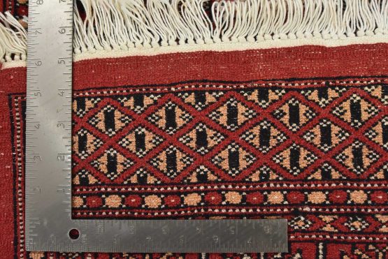 A tribal Bokhara rug hand-knotted with an all-wool pile on a cotton foundation. This finely woven oriental rug features rows of medallions set against a red background. It is new and in excellent condition.