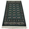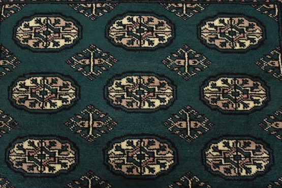 A tribal Bokhara rug hand-knotted with an all-wool pile on a cotton foundation. This finely woven oriental rug features rows of medallions surrounded by small geometric motifs set against a green background. It is new and in excellent condition.