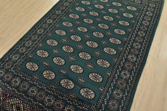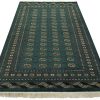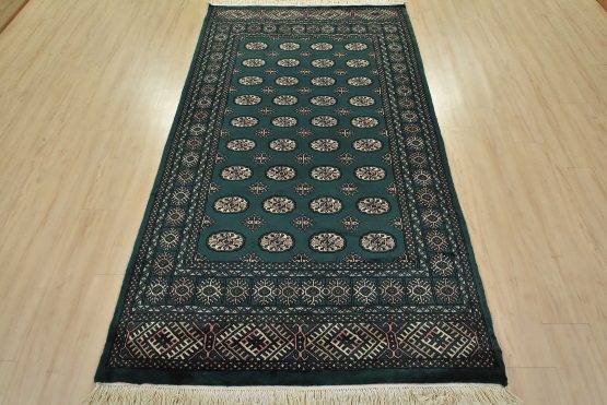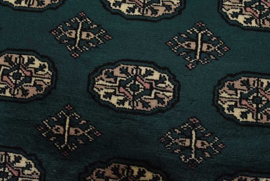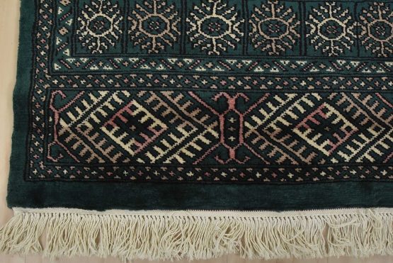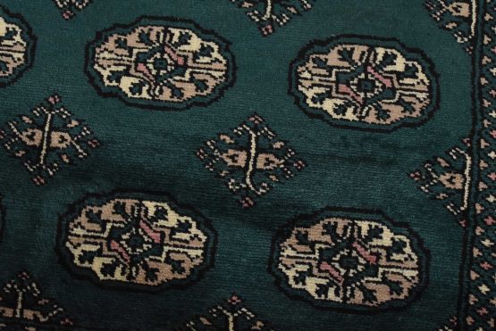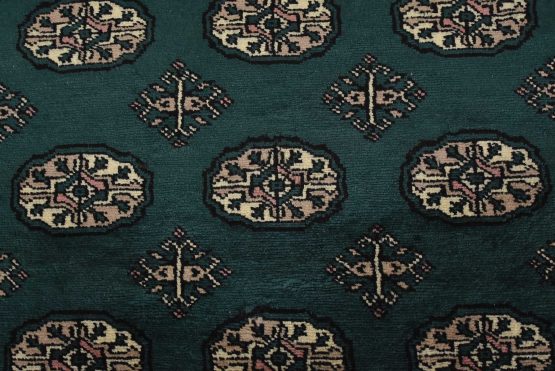 A tribal Bokhara rug hand-knotted with an all-wool pile on a cotton foundation. This finely woven oriental rug features rows of repeating medallions set against a green background. It is new and in excellent condition.