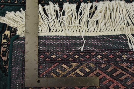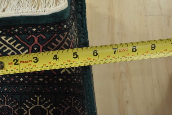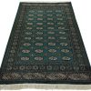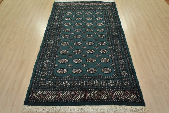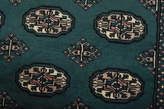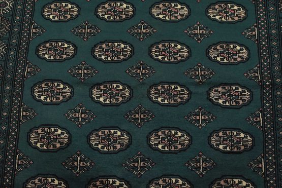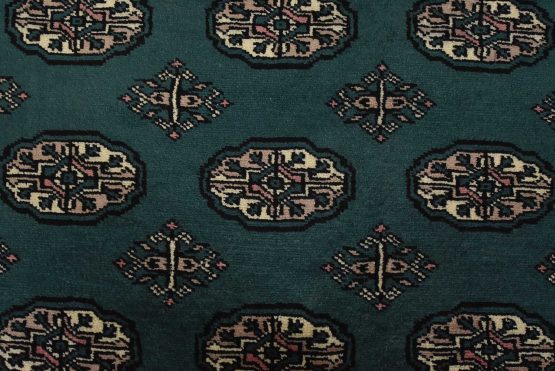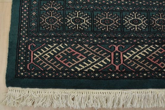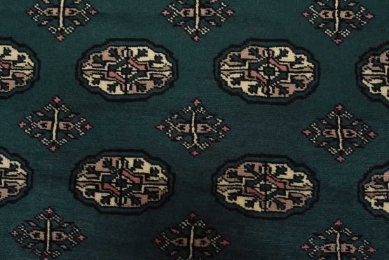 A tribal Bokhara rug hand-knotted with an all-wool pile on a cotton foundation. This finely woven oriental rug features rows of repeating medallions set against a green background. It is new and in excellent condition.