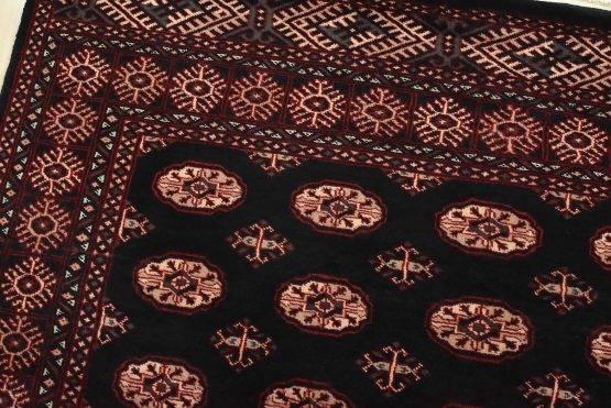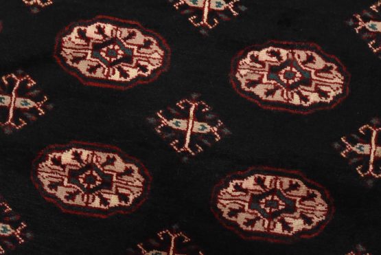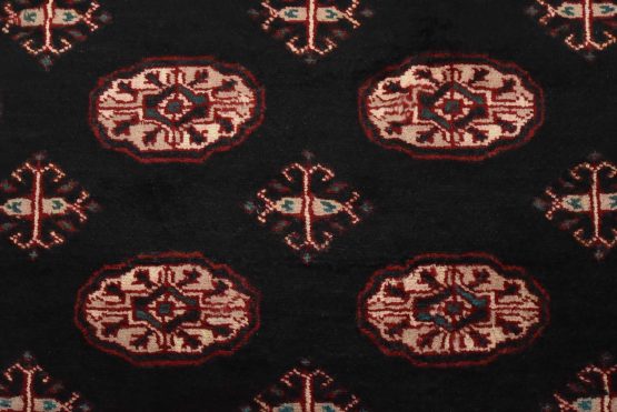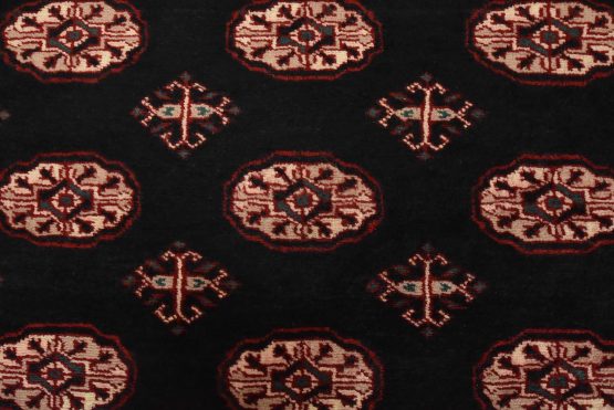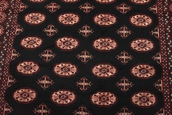 A tribal Bokhara rug hand-knotted with an all-wool pile on a cotton foundation. This finely woven oriental rug features rows of medallions set against a black background. It is new and in excellent condition.