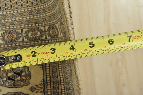 A tribal Bokhara rug hand-knotted with an all-wool pile on a cotton foundation. This finely woven oriental rug features rows of small geometric medallions set against a beige background. It is new and in excellent condition.