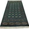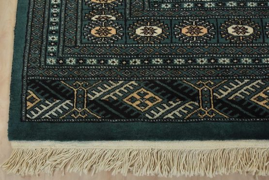 A tribal Bokhara rug hand-knotted with an all-wool pile on a cotton foundation. This finely woven oriental rug features rows of small repeating medallions set against a green background. It is new and in excellent condition.