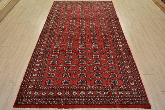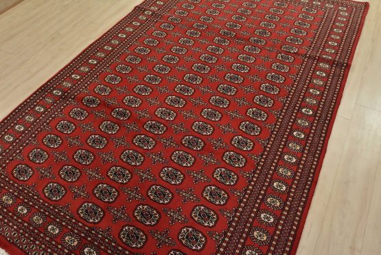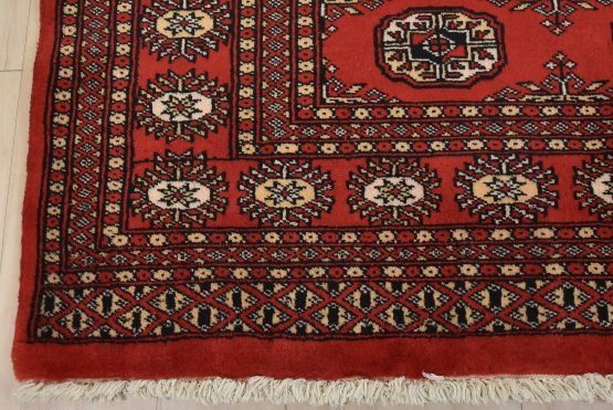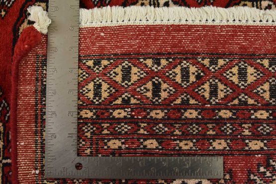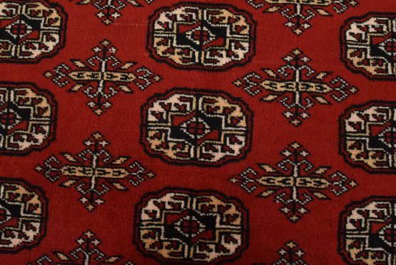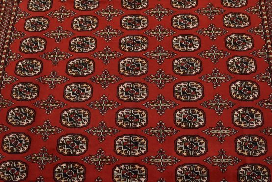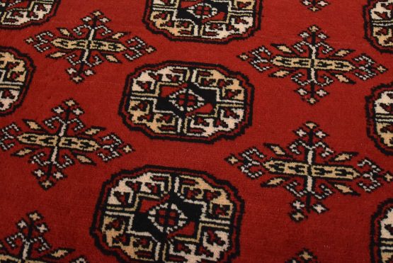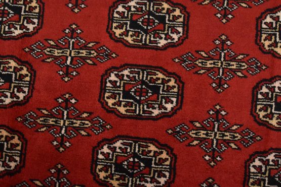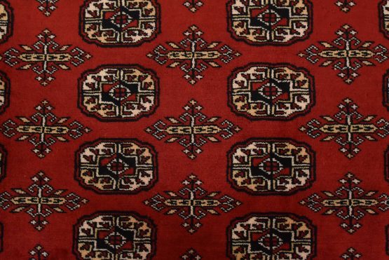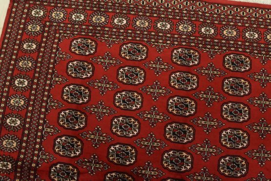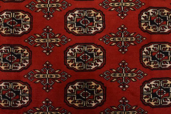 Bokhara rugs have small, repeating geometric designs woven with fine wool. The most common Bokhara design consists of rows of “Tekke” guls or medallions (the Tekkes were one of the Turkmen tribes). Bokhara rugs are made in Pakistan, Turkey, Uzbekistan, and Afghanistan.