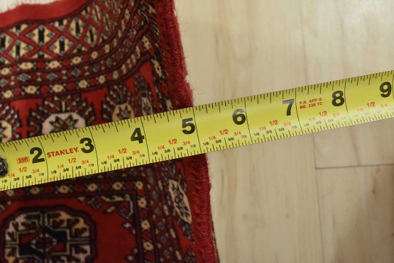 A tribal Bokhara rug hand-knotted with an all-wool pile on a cotton foundation. This finely woven oriental rug features rows of repeating geometric medallions set against a red background. It is new and in excellent condition.
