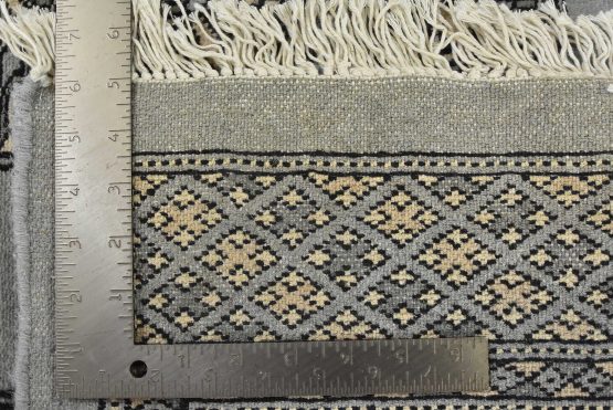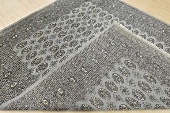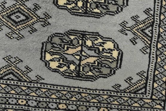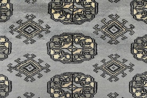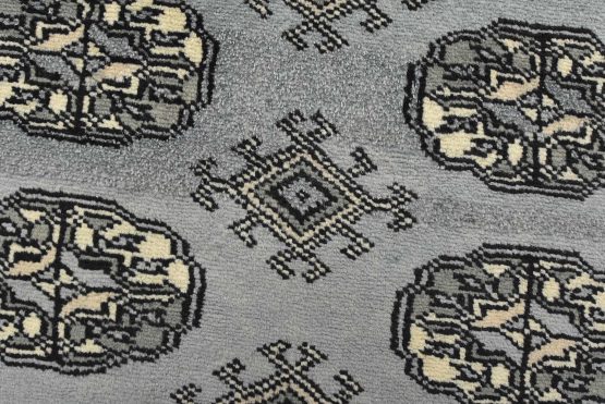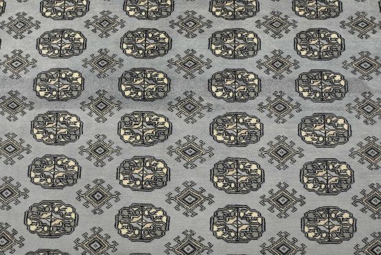 A tribal Bokhara rug hand-knotted with an all-wool pile on a cotton foundation. This finely woven oriental rug features rows of repeating medallions set against a gray background. It is new and in excellent condition.