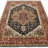 A traditional tribal Heriz rug hand-knotted with an all-wool pile on a cotton foundation. This oriental rug features a central medallion surrounded by a geometric botanical design. It is new and in excellent condition.