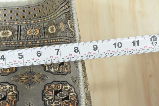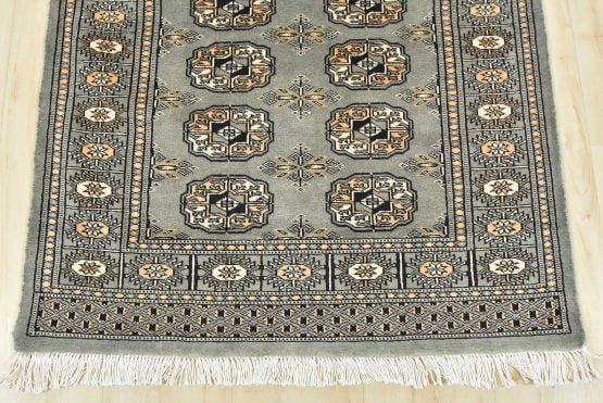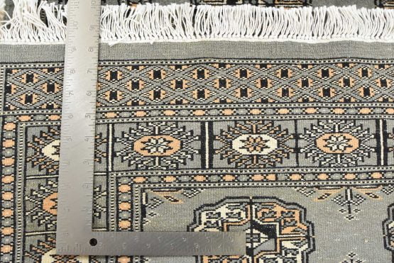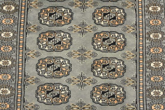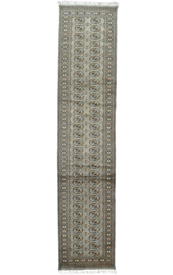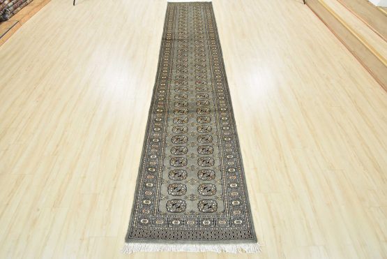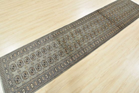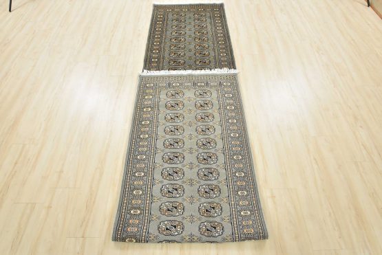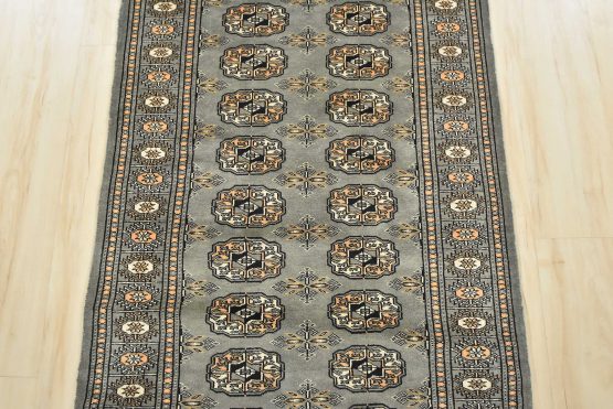 A tribal Bokhara runner hand-knotted with an all-wool pile on a cotton foundation. This finely woven oriental rug features rows of repeating medallions set against a gray background. It is new and in excellent condition.