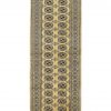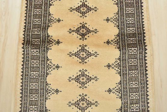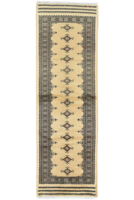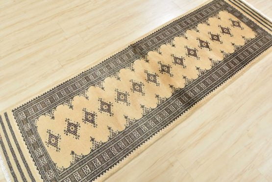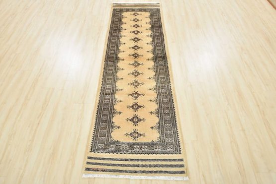 A tribal Bokhara runner hand-knotted with an all-wool pile on a cotton foundation. This finely woven oriental rug features a row of geometric motifs set against a beige background. It is new and in excellent condition.