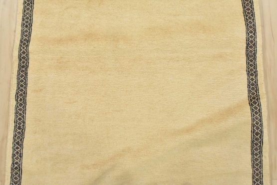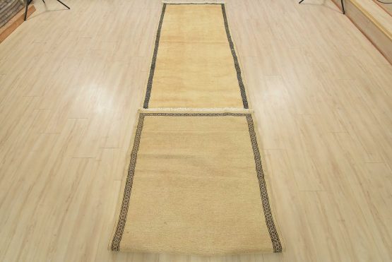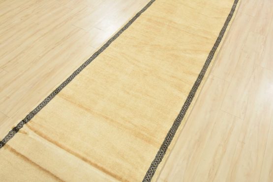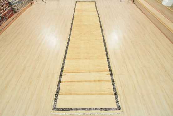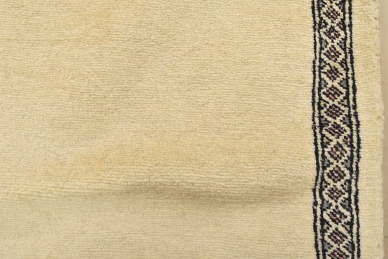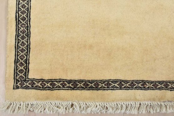 A tribal Bokhara runner hand-knotted with an all-wool pile on a cotton foundation. This finely woven oriental rug features a solid beige background framed by a border with a geometric pattern. It is new and in excellent condition.