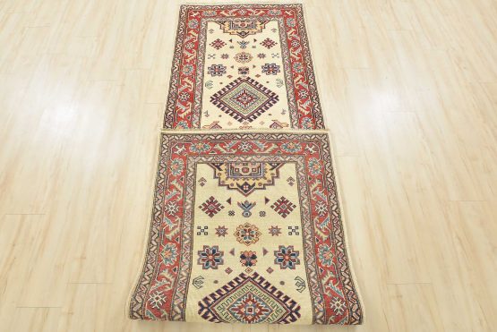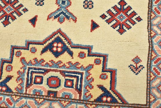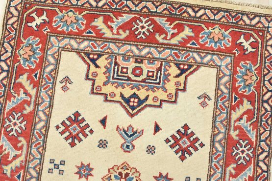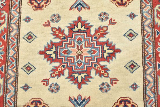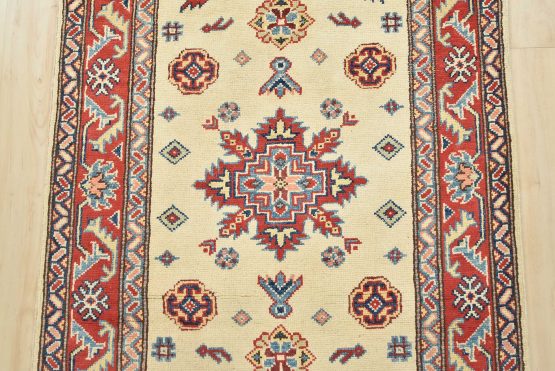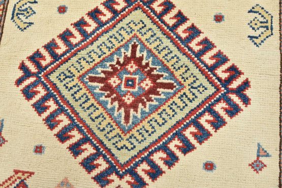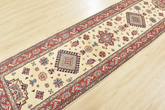 A tribal Caucasian Kazak runner hand-knotted with an all-wool pile on a cotton foundation. This oriental rug features geometric medallions surrounded by small geometric motifs set against a beige background. It is new and in excellent condition.