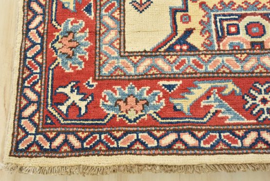 Original antique Kazak rugs from the Caucasus region inspire the creation of new Kazak rugs. These rugs are woven with fine wool using traditional Kazak patterns and finished with a low-cut pile to give them an authentic vintage look.
