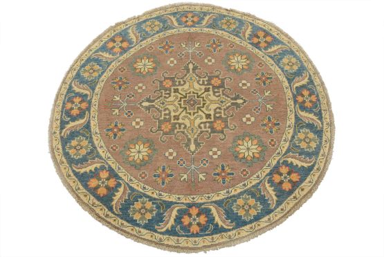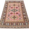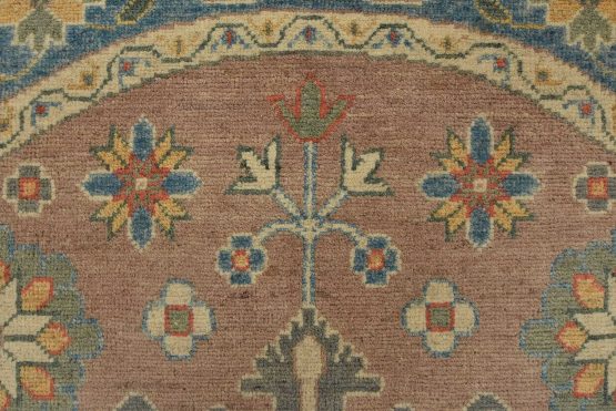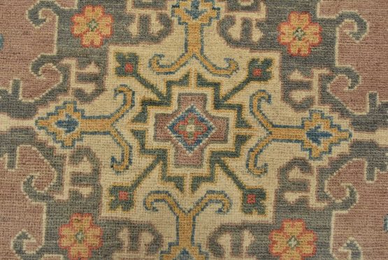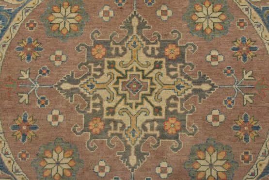 A traditional Caucasian rug hand-knotted with an all-wool pile on a cotton foundation. This oriental rug features a central geometric medallion surrounded by small geometric motifs set against a brown background. It is new and in excellent condition.