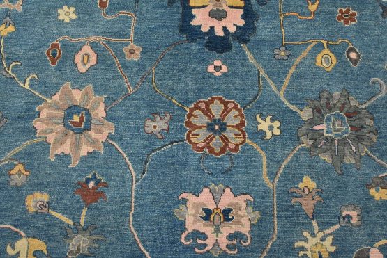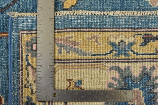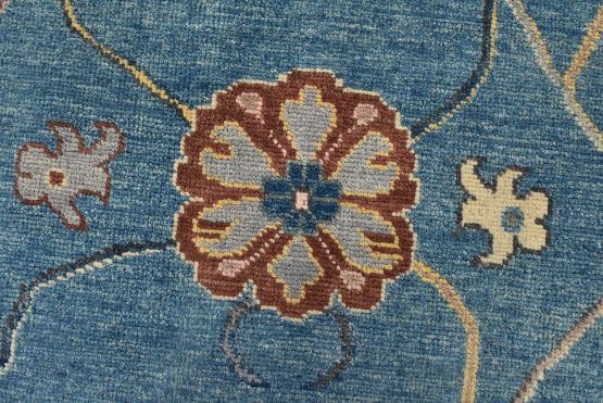 A traditional Caucasian rug hand-knotted with an all-wool pile on a cotton foundation. This oriental rug features an all-over botanical design set against a blue background. It is new and in excellent condition.
