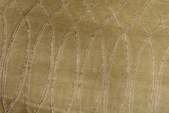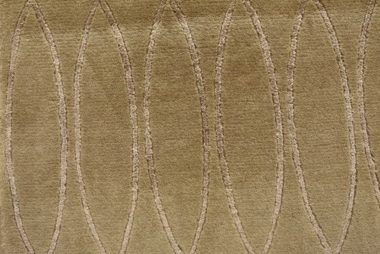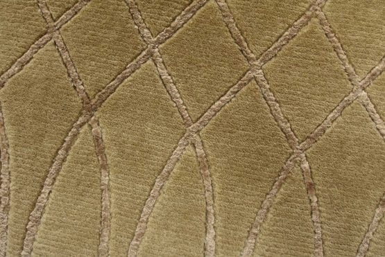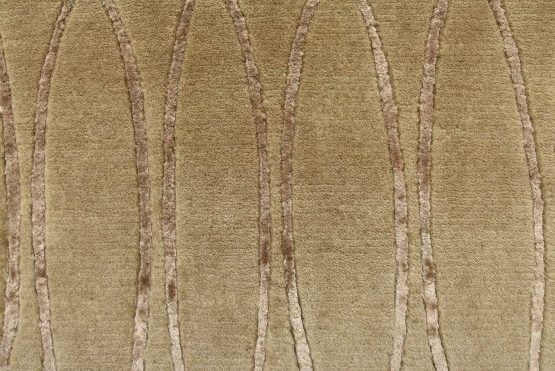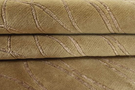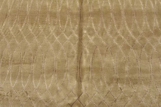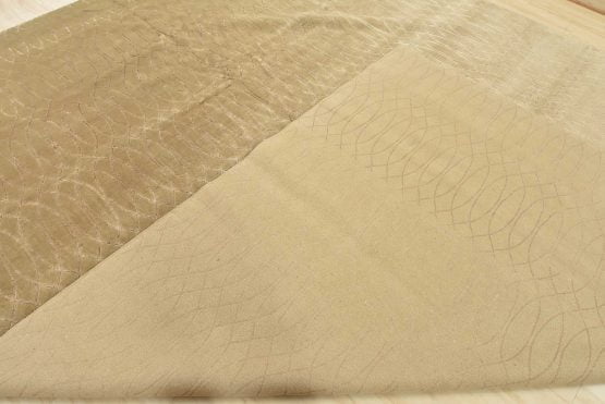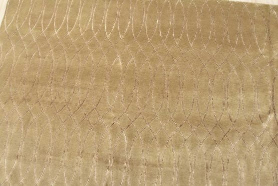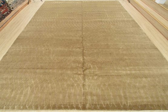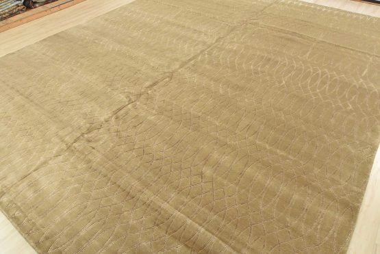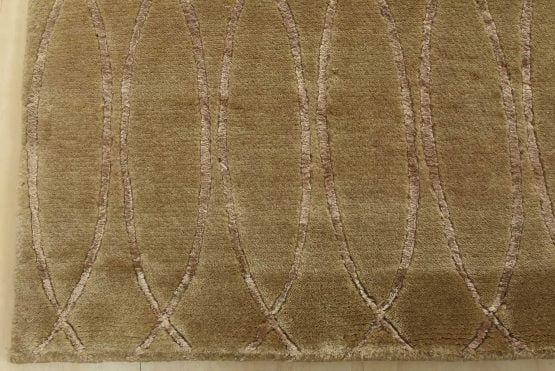 A contemporary area rug hand-knotted with a wool pile with viscose highlights on a cotton foundation. This finely woven oriental rug features an all-over curvilinear pattern set against a brown background. It is new and in excellent condition.