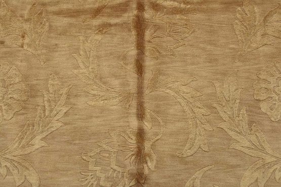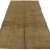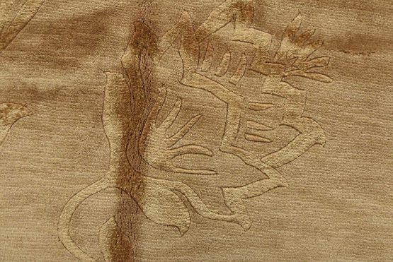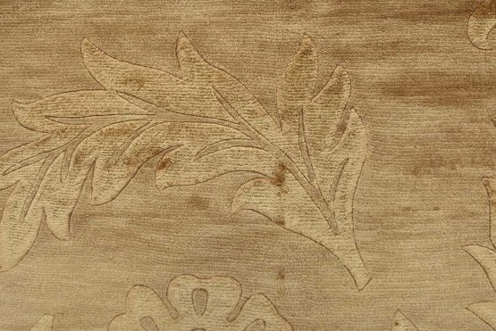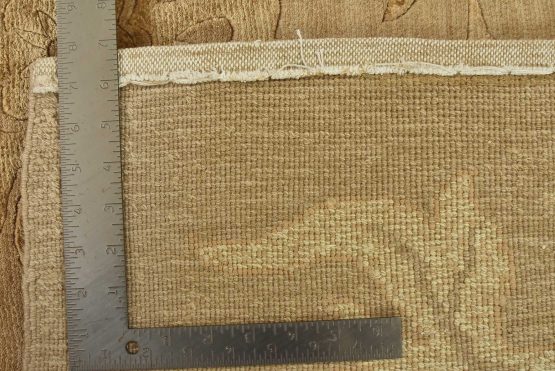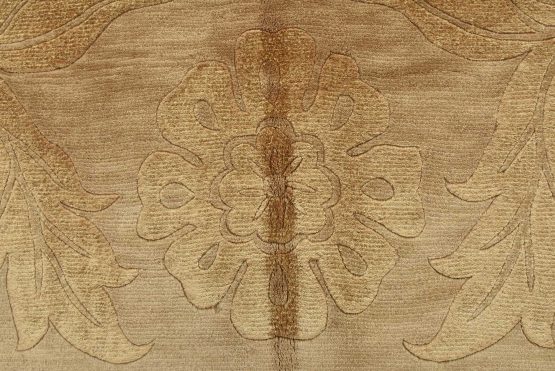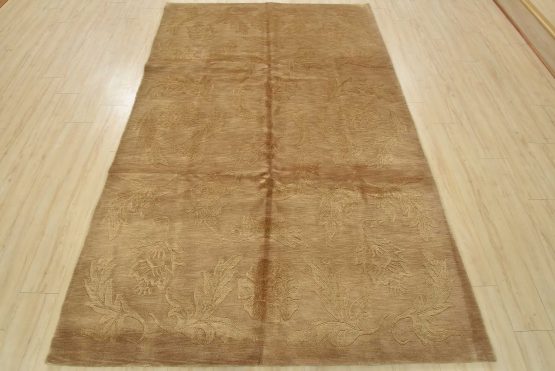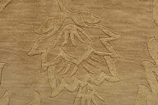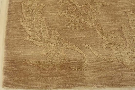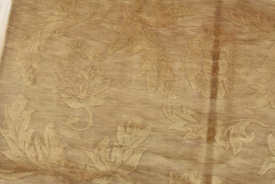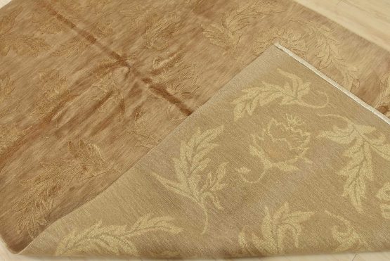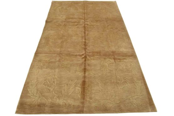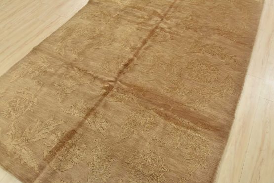 A contemporary rug hand-knotted with an all-wool pile on a cotton foundation. This area rug features an all-over botanical design set against a gold background. It is new and in excellent condition.