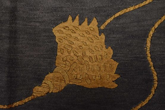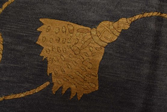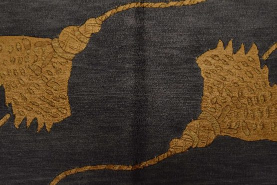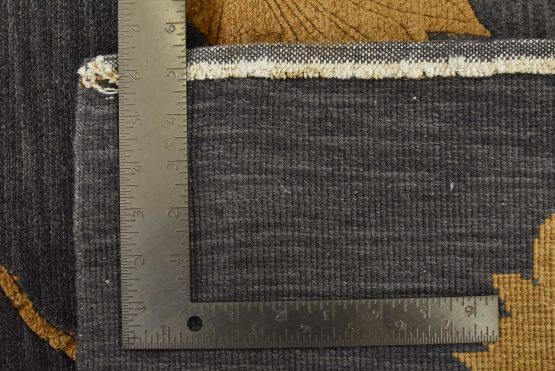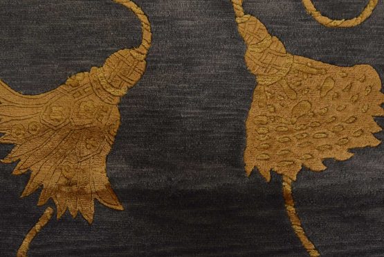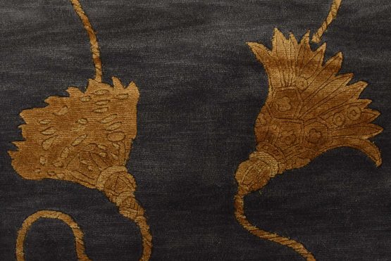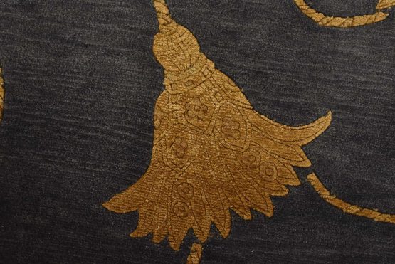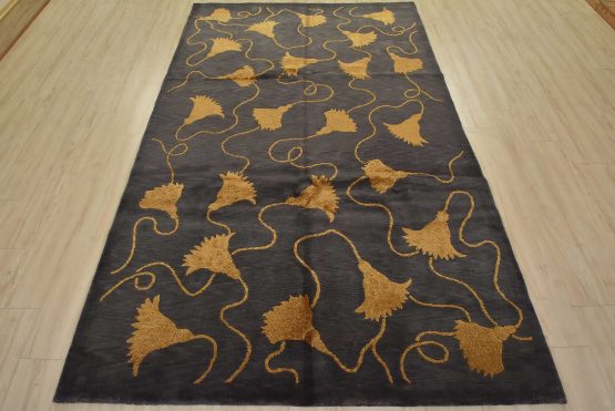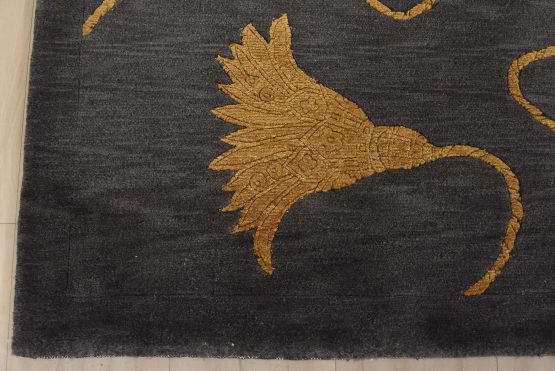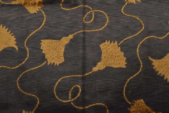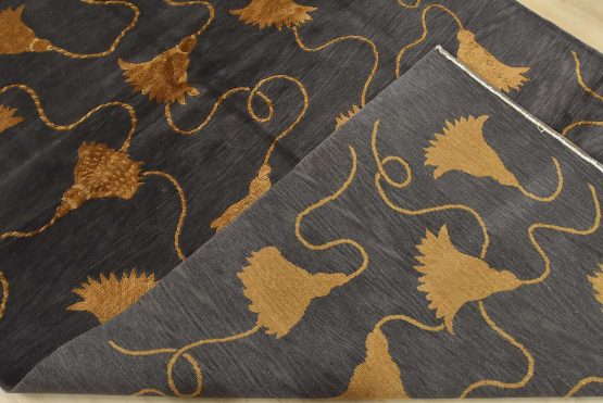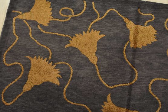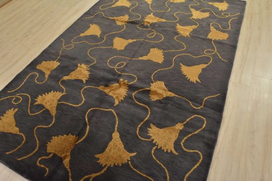 A contemporary area rug hand-knotted with a wool and silk pile on a cotton foundation. This finely woven oriental rug features an all-over design of gold tassels set against a dark gray background. It is new and in excellent condition.