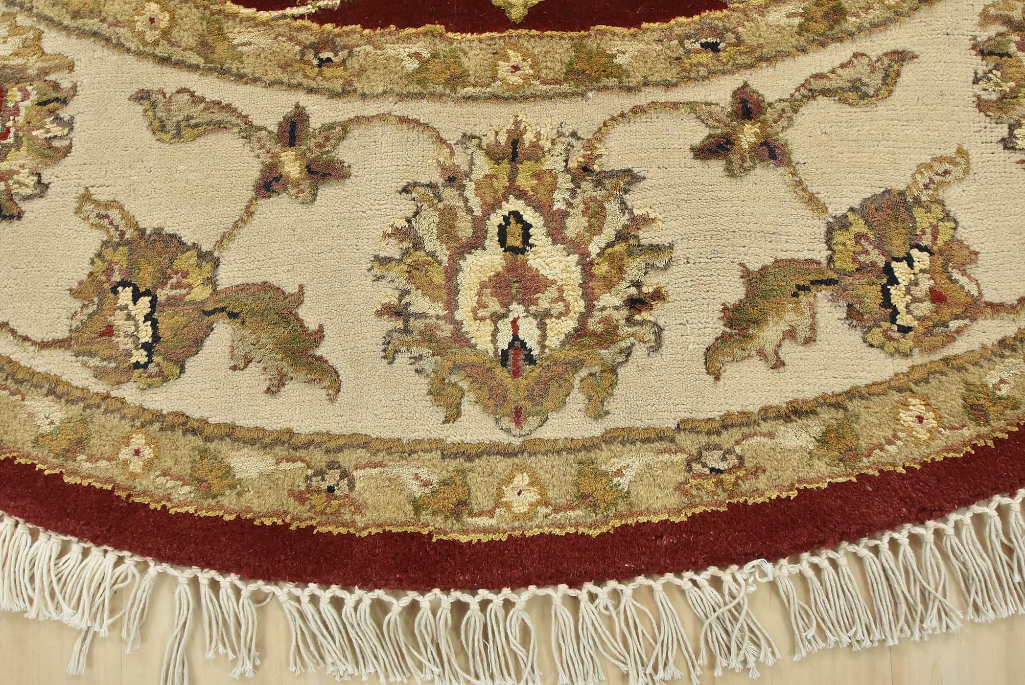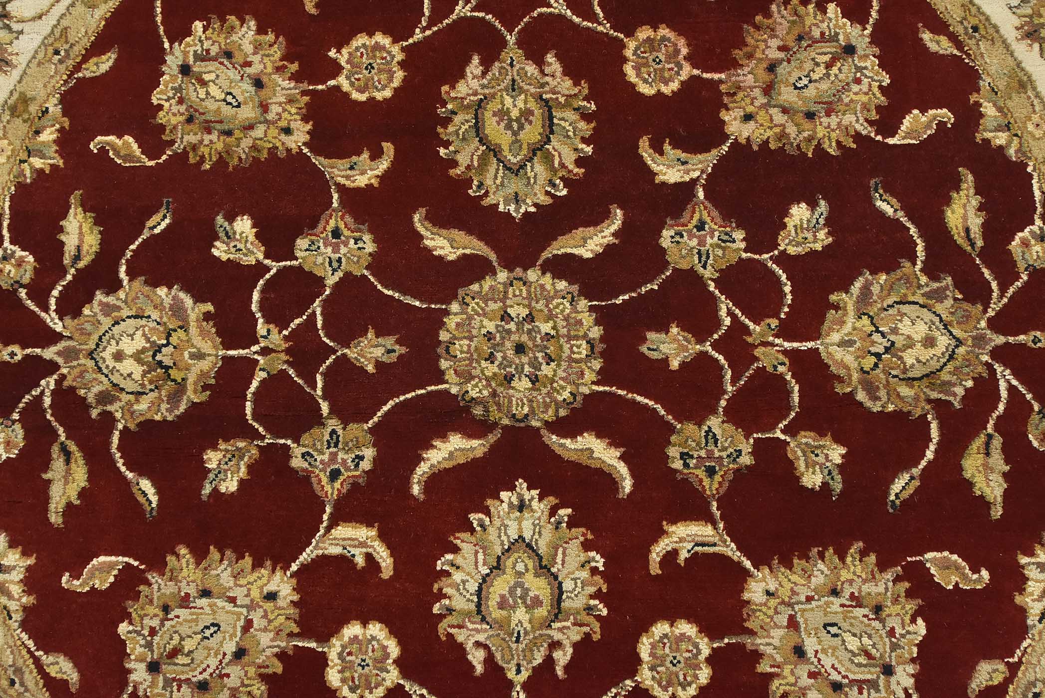 A traditional Agra rug is hand-knotted with a wool and silk pile on a cotton foundation. This finely woven oriental rug features an all-over floral design set against a red background. It is new and in excellent condition.