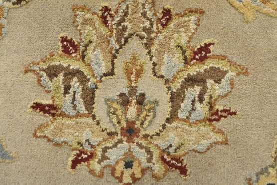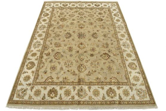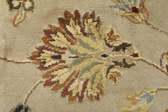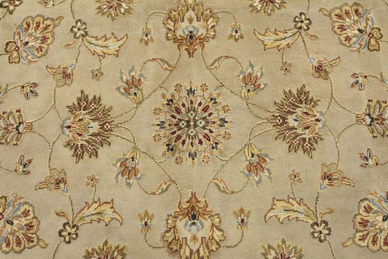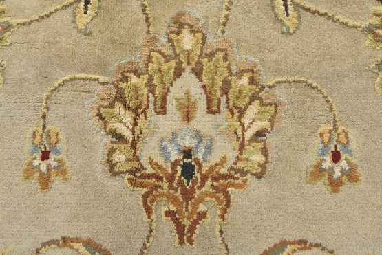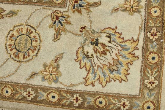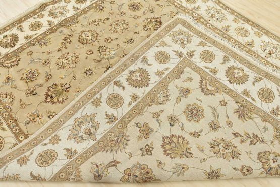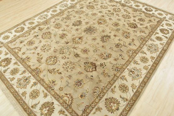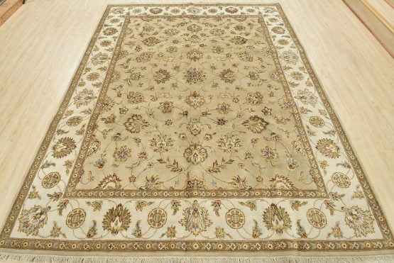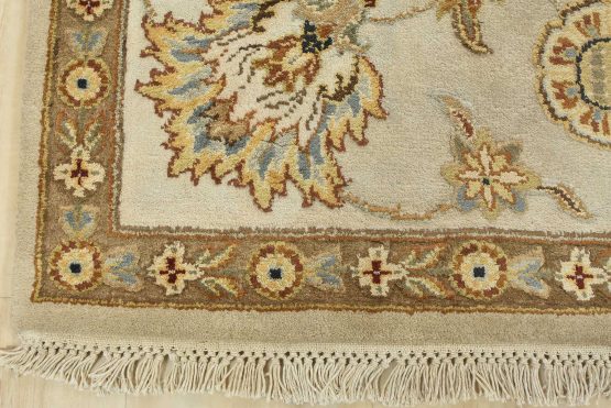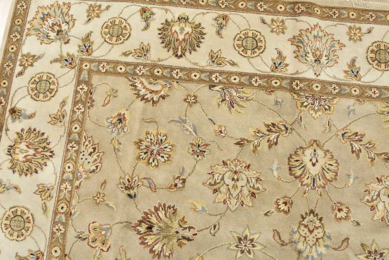 A traditional Agra rug is hand-knotted with a wool and silk pile on a cotton foundation. This finely woven oriental rug features an all-over floral design set against a beige background. It is new and in excellent condition.