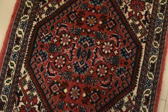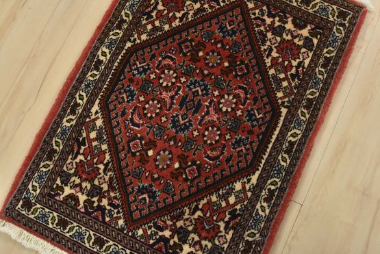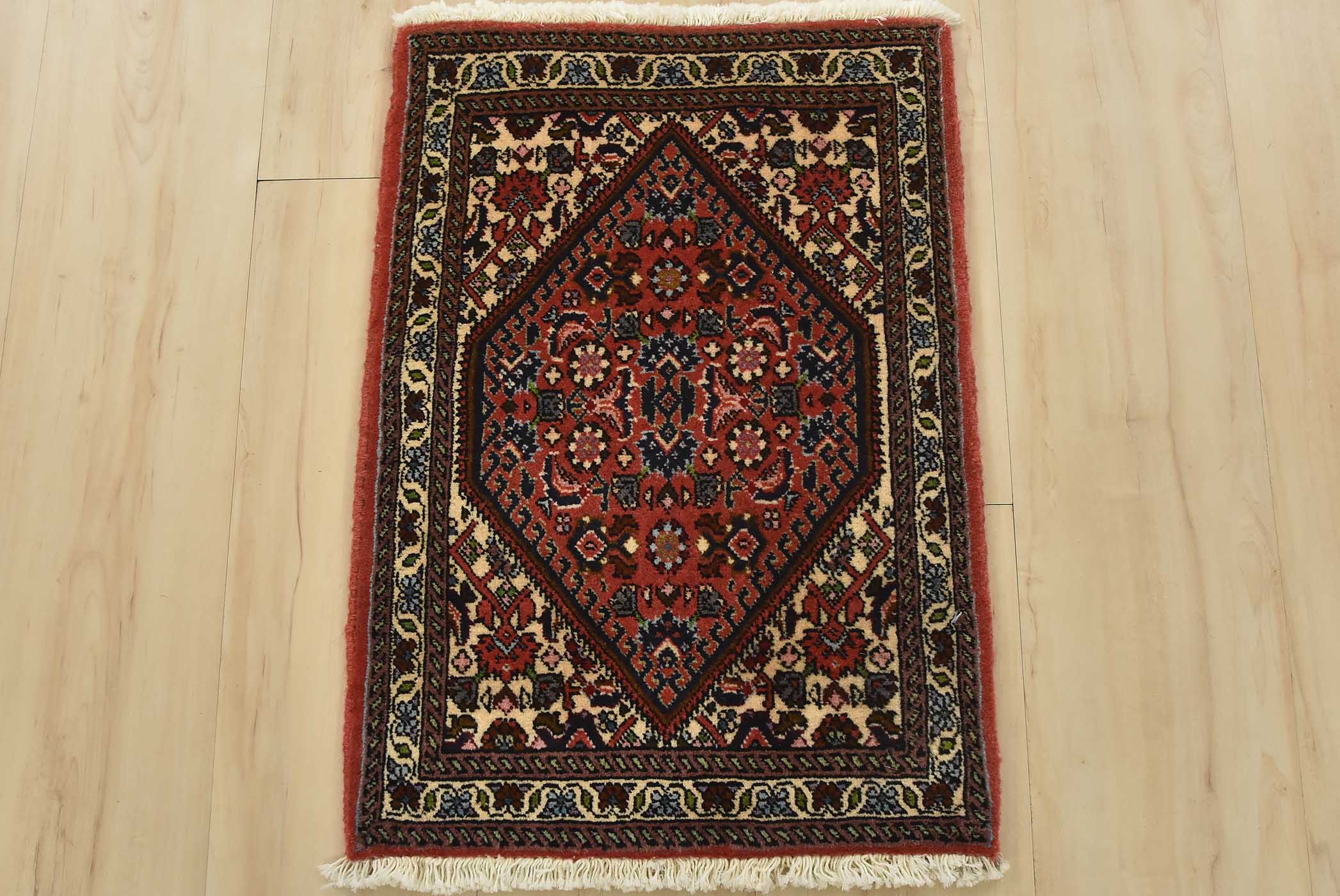 An authentic vintage traditional Bidjar rug hand-knotted with fine wool and natural dyes. This intricately woven oriental rug features a central medallion with a Herati pattern. It has a full wool pile with no worn areas and is in very good condition.