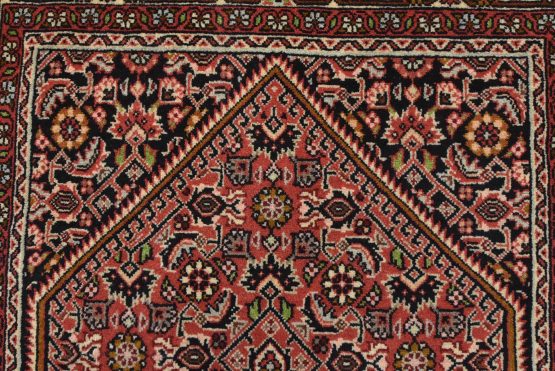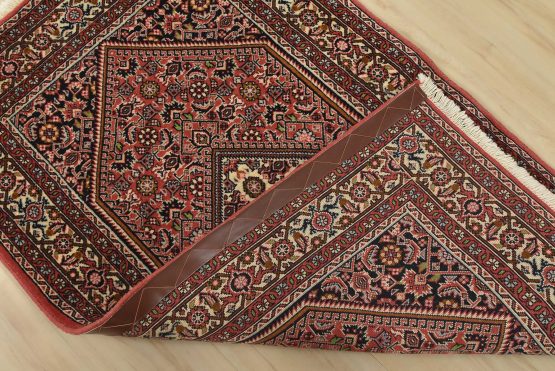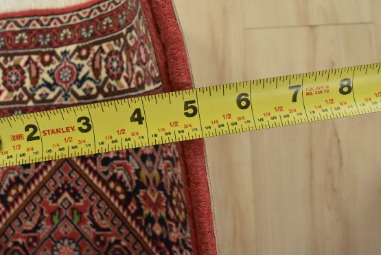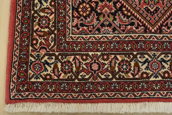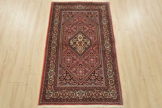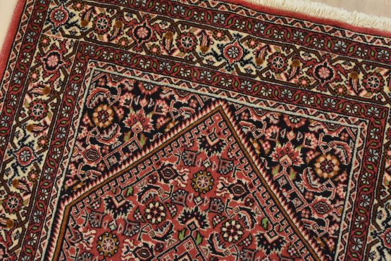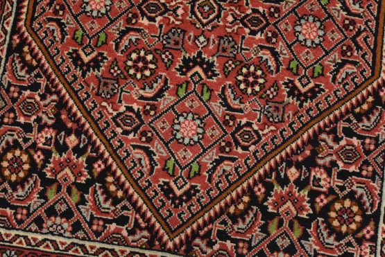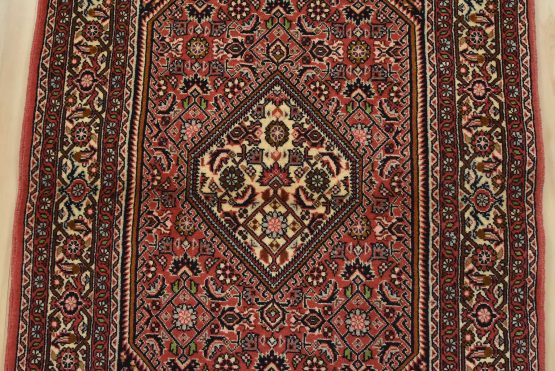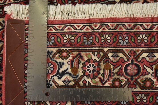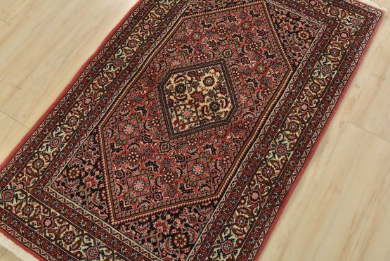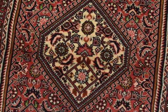 An authentic vintage traditional Bidjar rug hand-knotted with fine wool and natural dyes. This intricately woven rug features a geometric central medallion surrounded by a Herati pattern set against a red background. It has a full wool pile with no worn areas and is in very good condition.