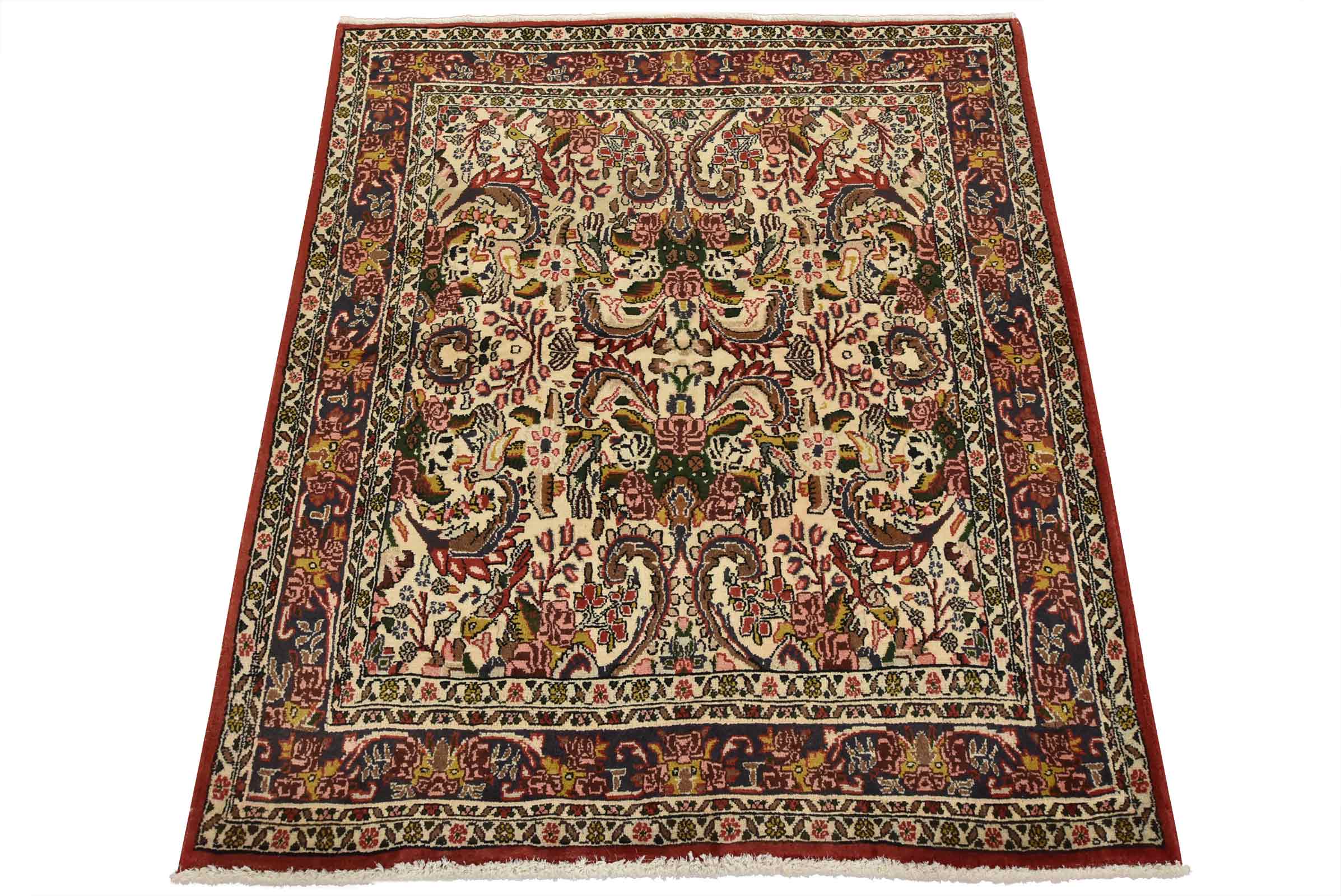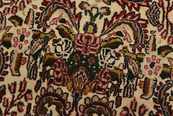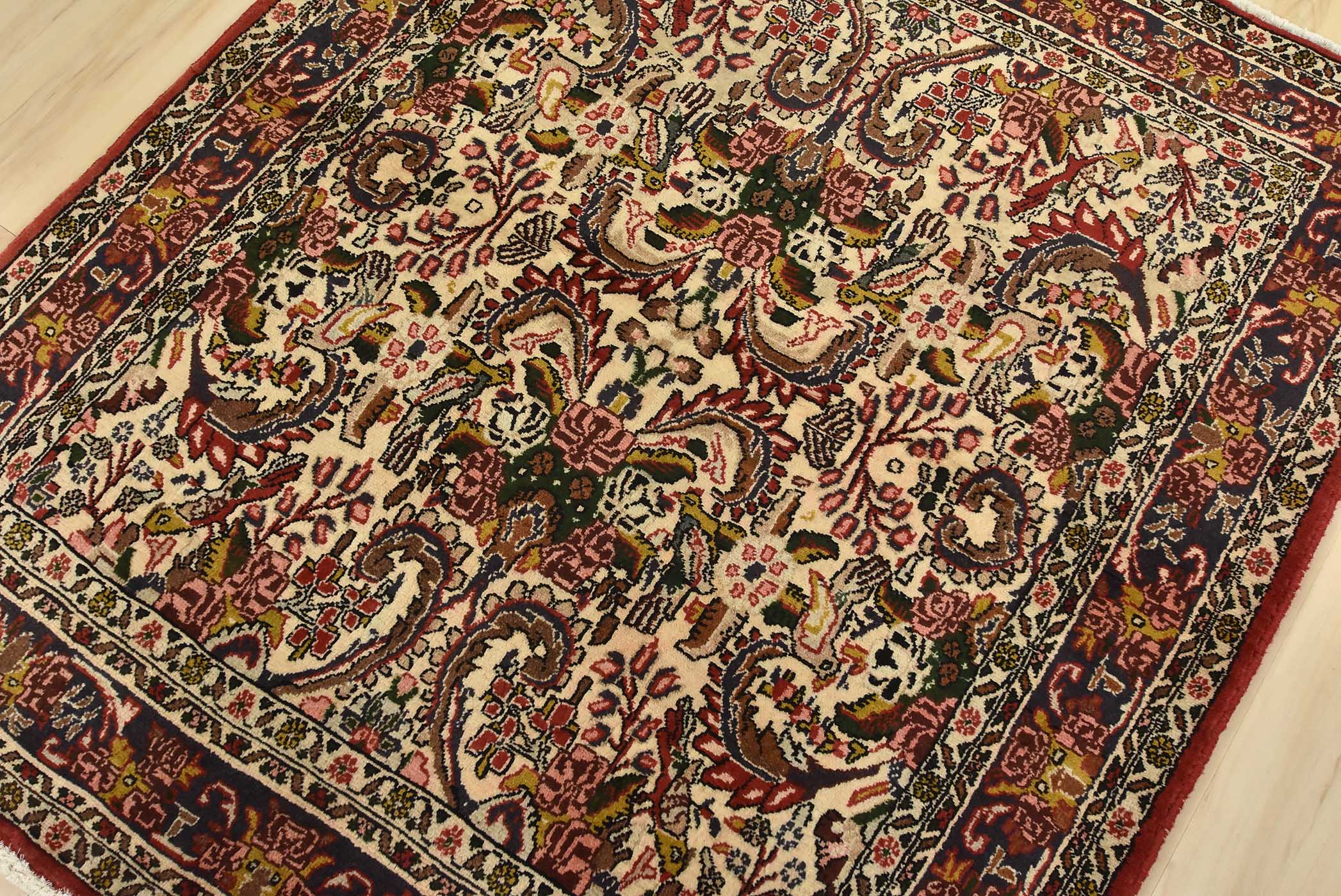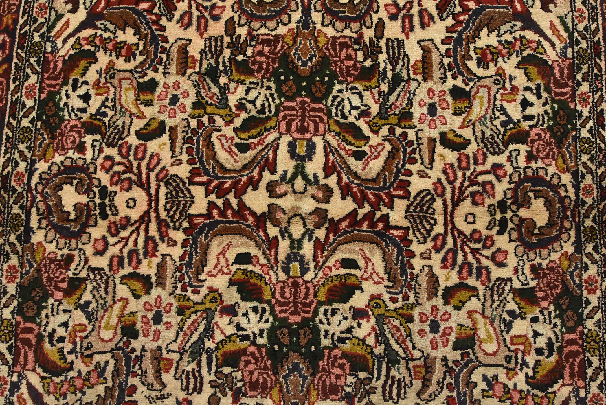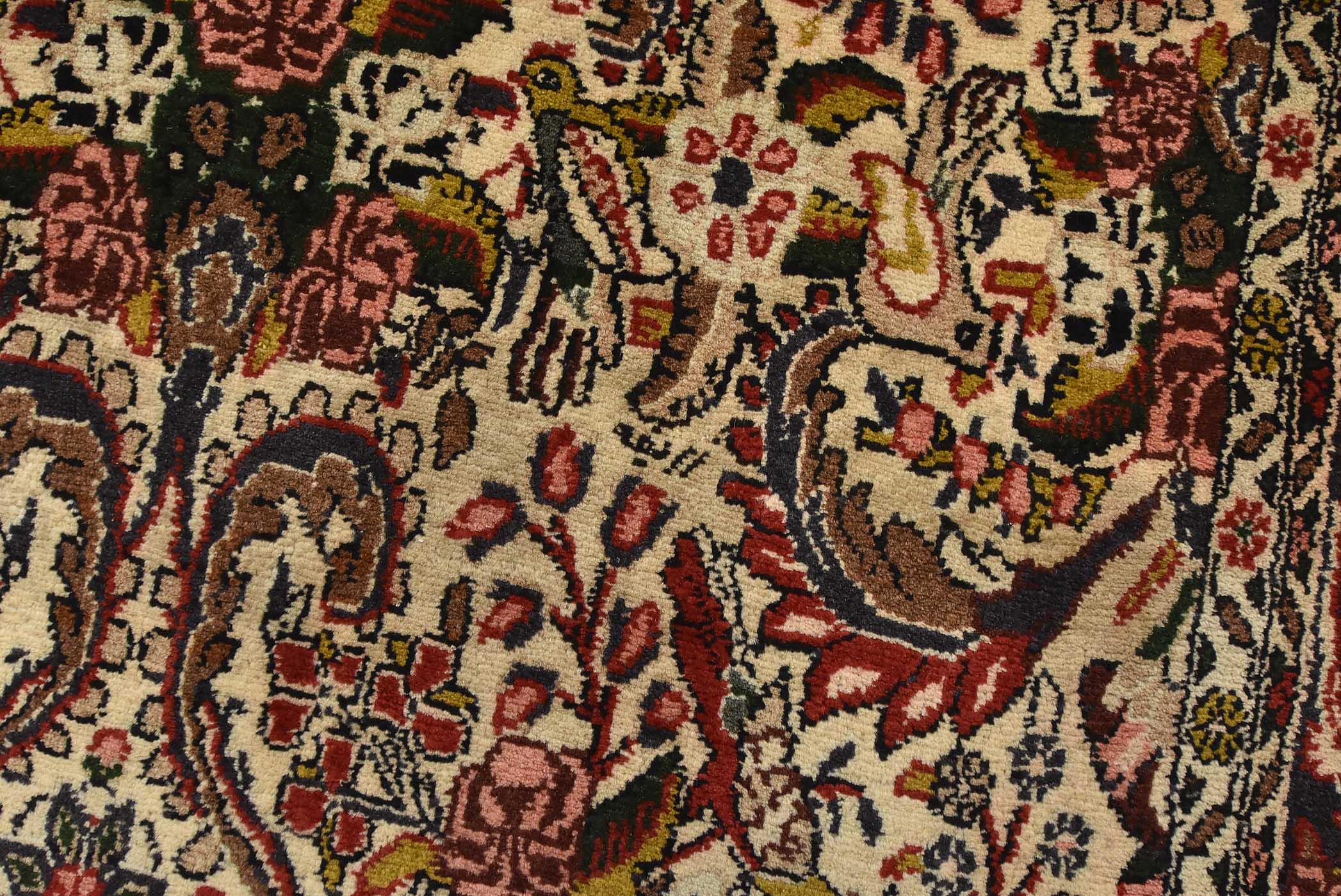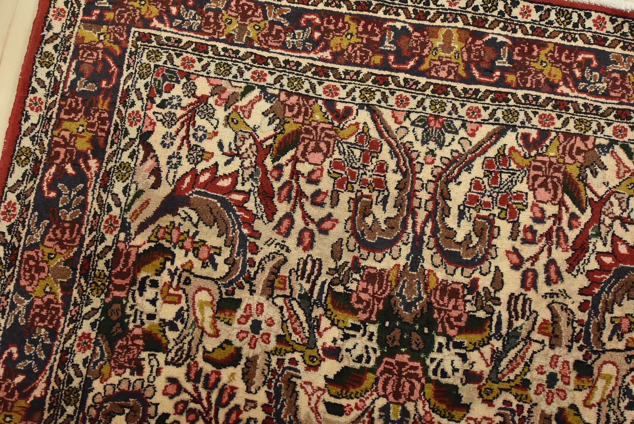 An authentic vintage traditional Bidjar rug hand-knotted with fine wool and natural dyes. This intricately woven rug features an all-over botanical design interspersed with bird motifs set against an ivory background. It has a full wool pile with no worn areas and is in very good condition.