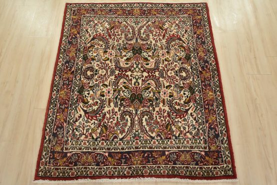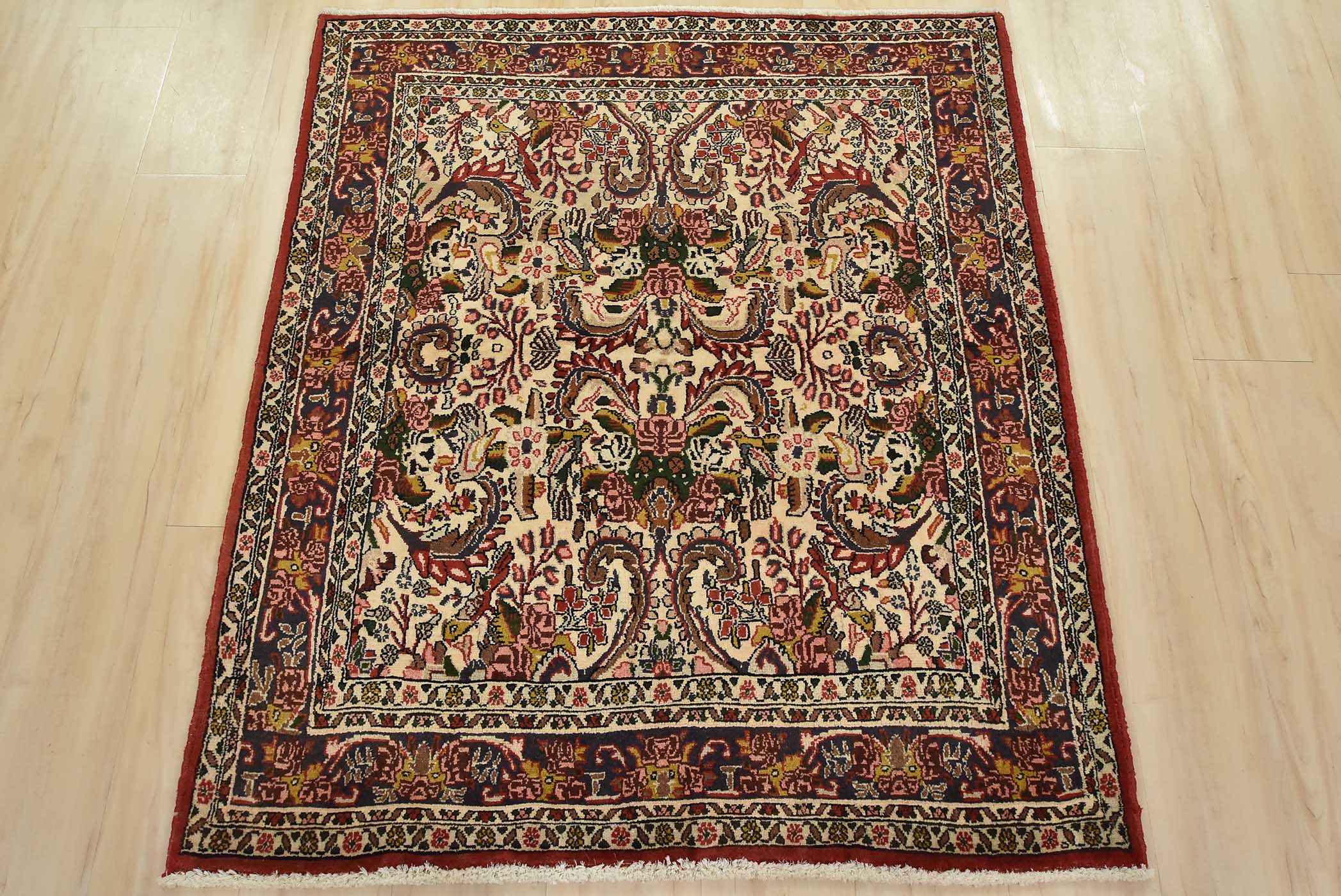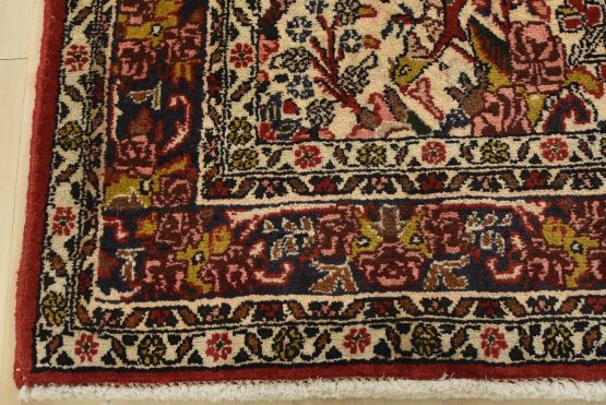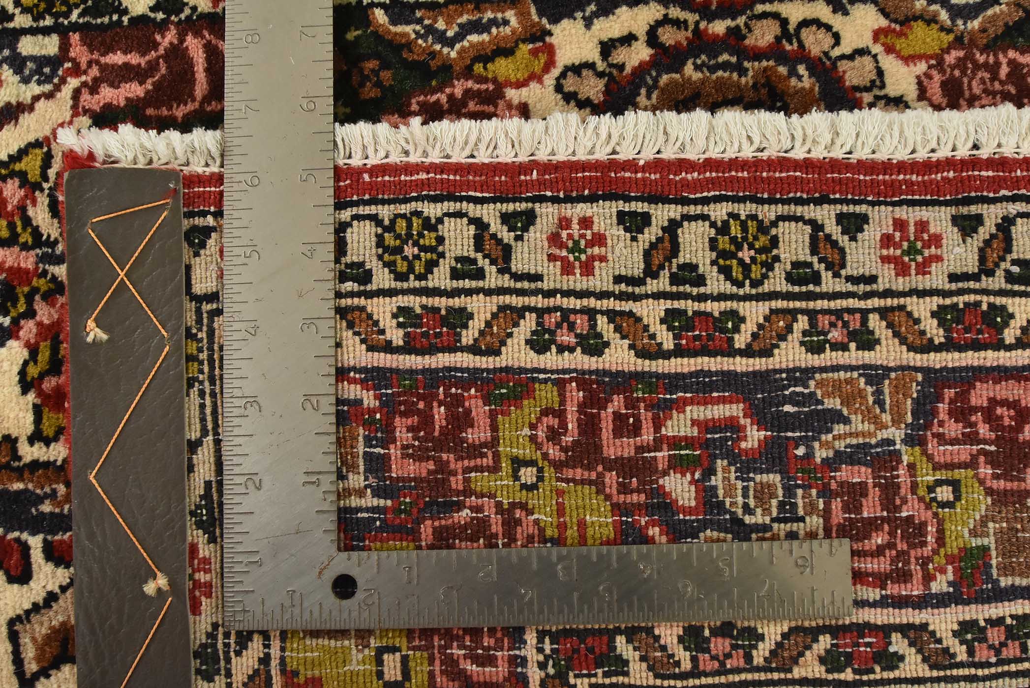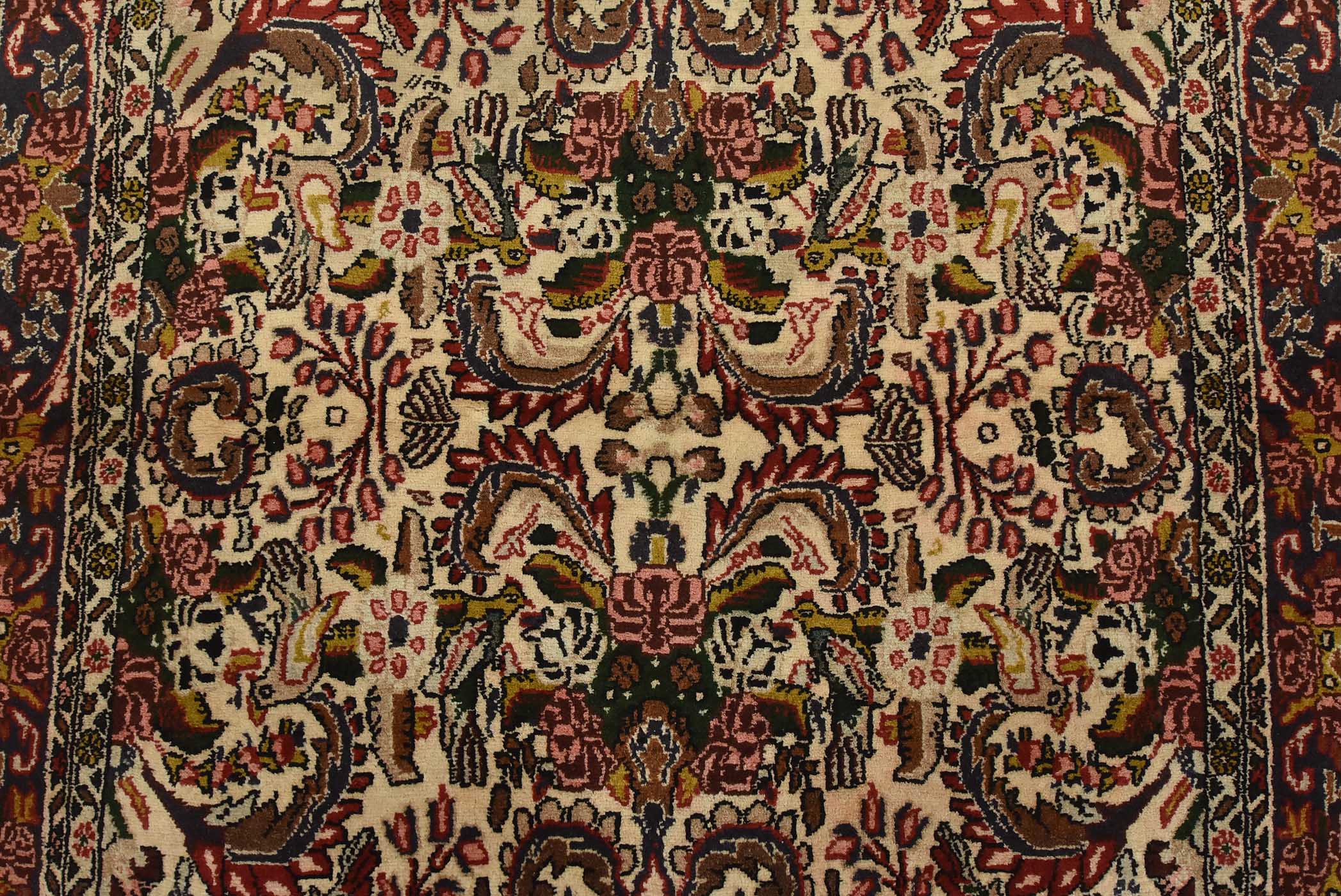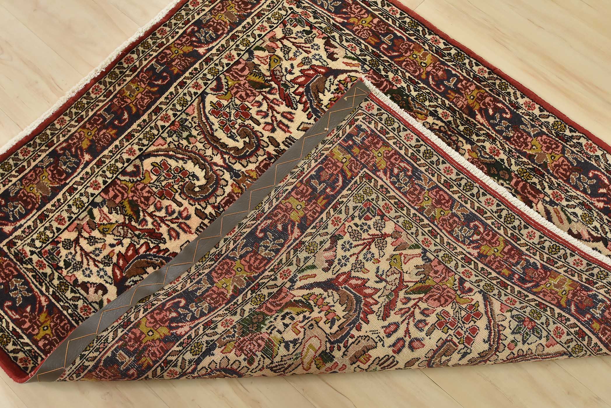 An authentic vintage traditional Bidjar rug hand-knotted with fine wool and natural dyes. This intricately woven rug features an all-over botanical design interspersed with bird motifs set against an ivory background. It has a full wool pile with no worn areas and is in very good condition.