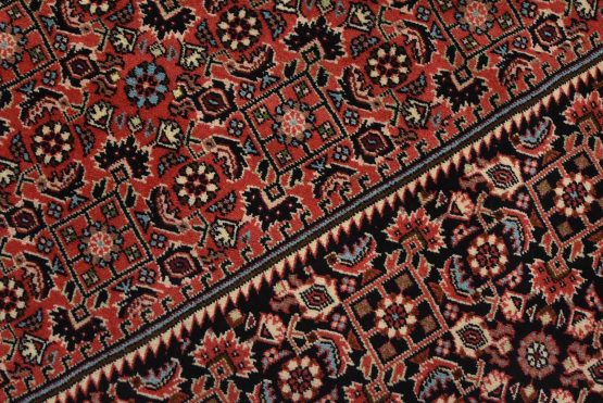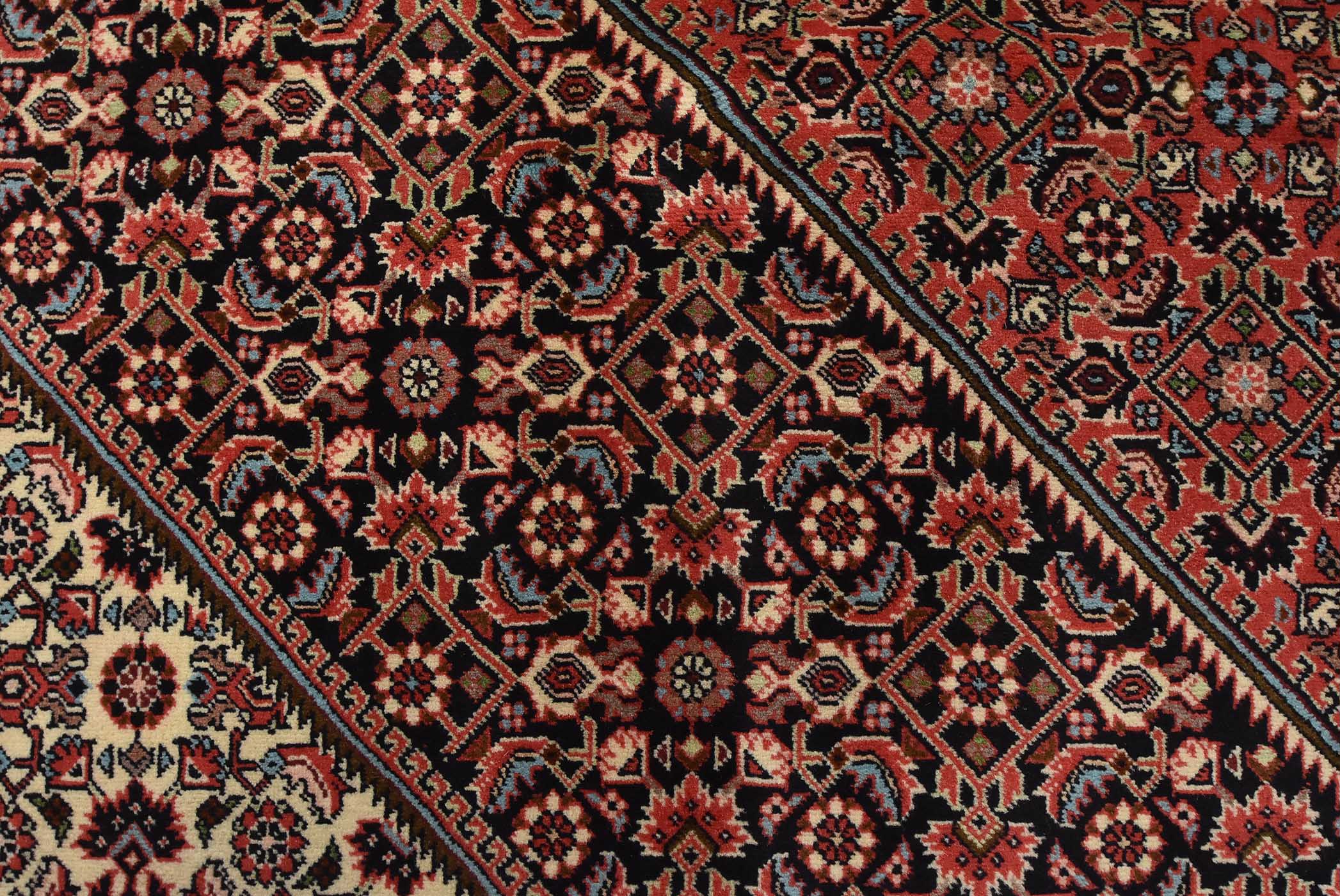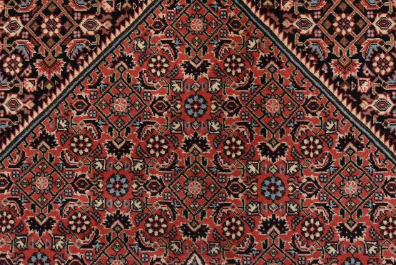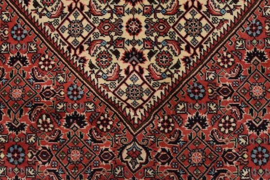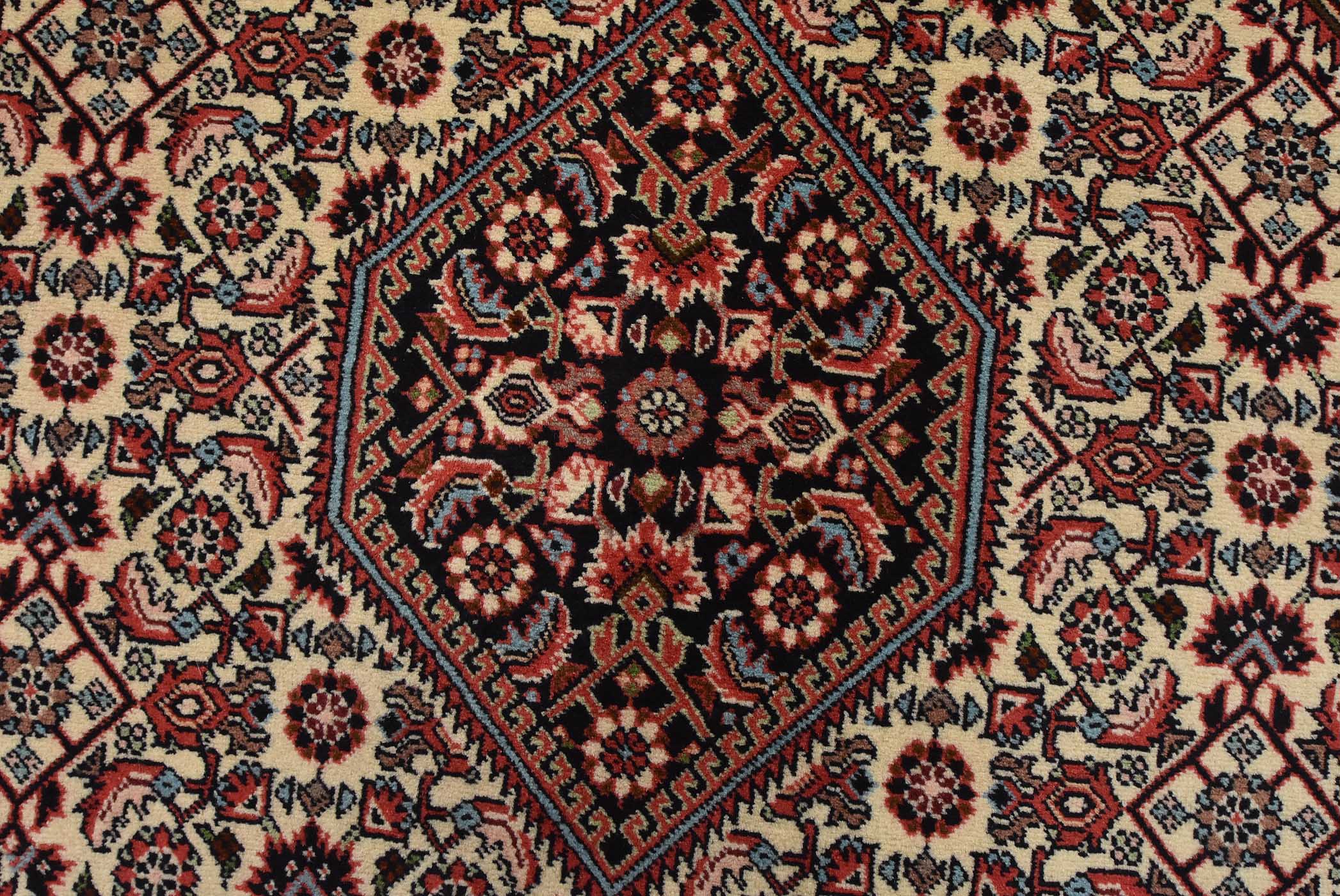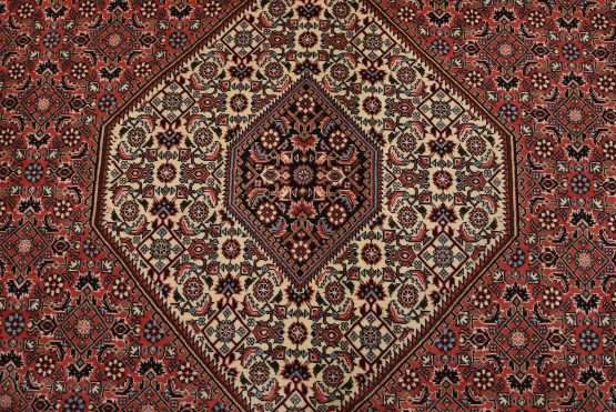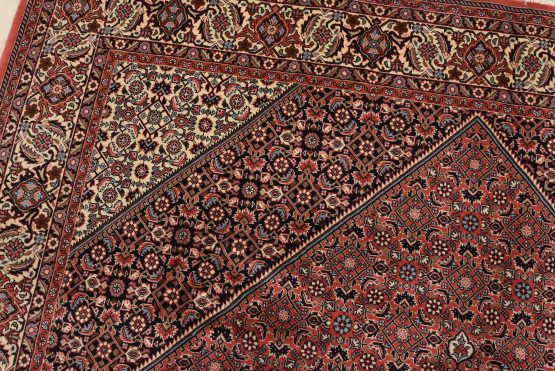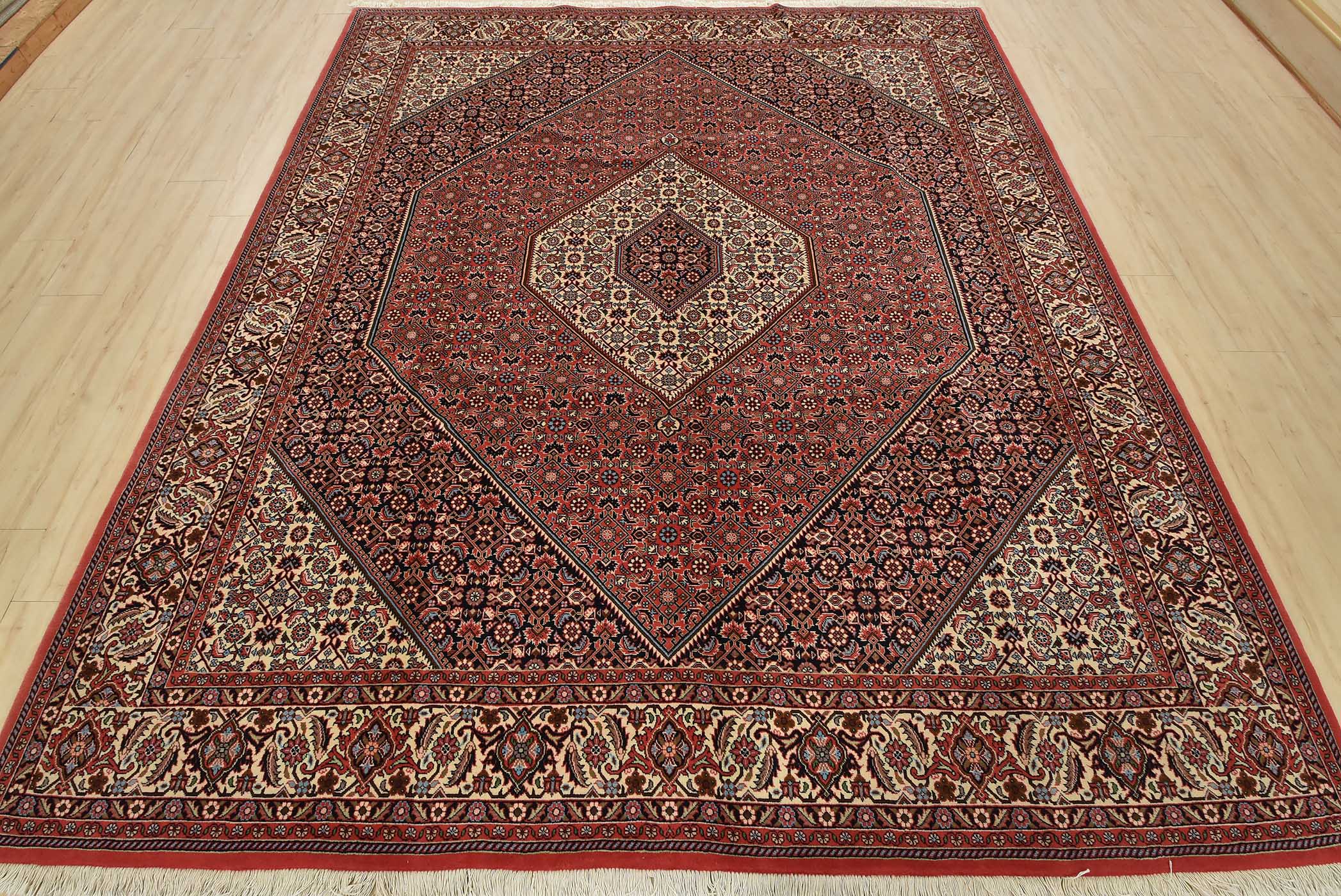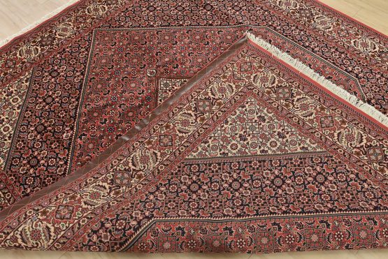An authentic vintage traditional Bidjar rug hand-knotted with fine wool and natural dyes. This intricately woven rug features a geometric central medallion surrounded by a Herati pattern set against a red background. It has a full wool pile with no worn areas and is in very good condition.