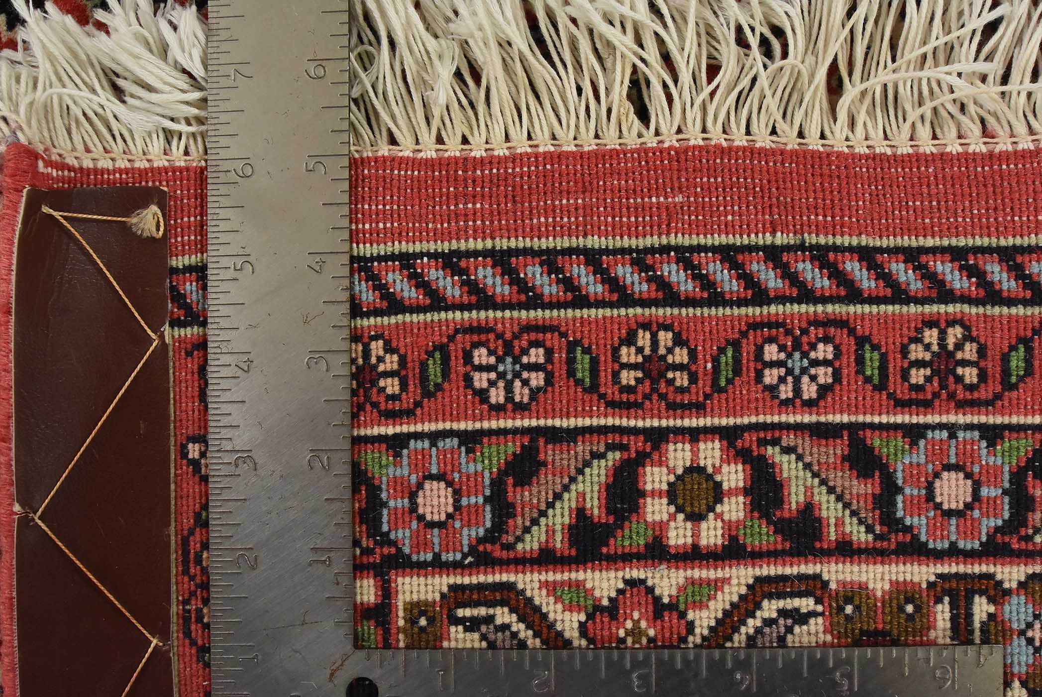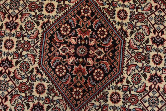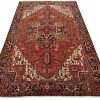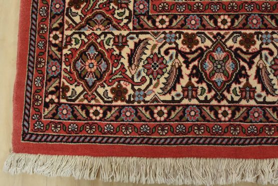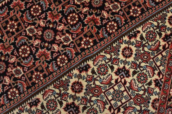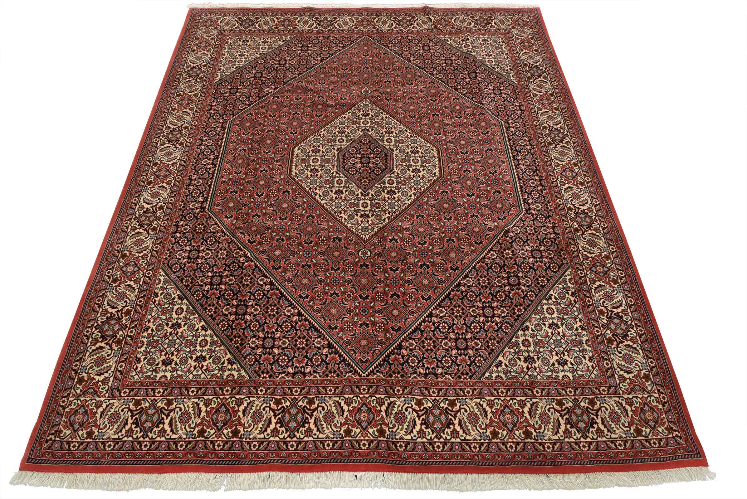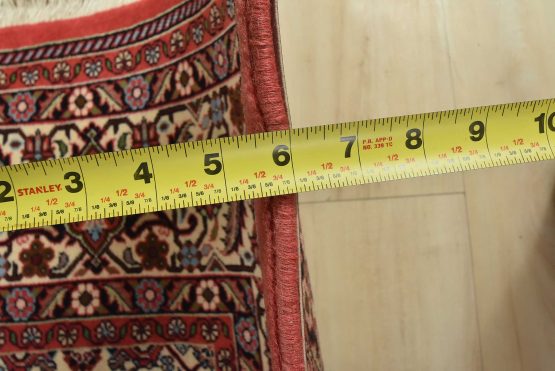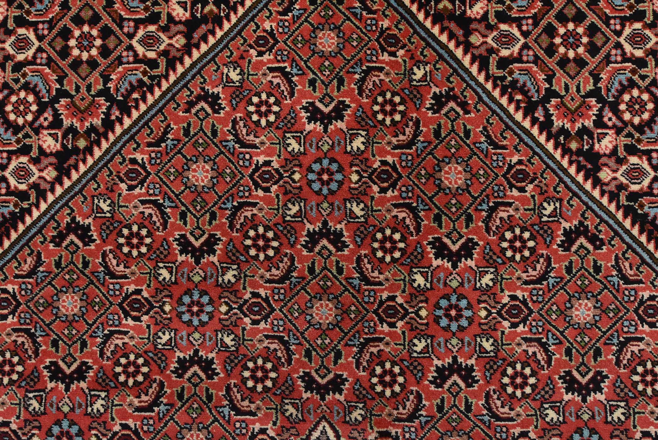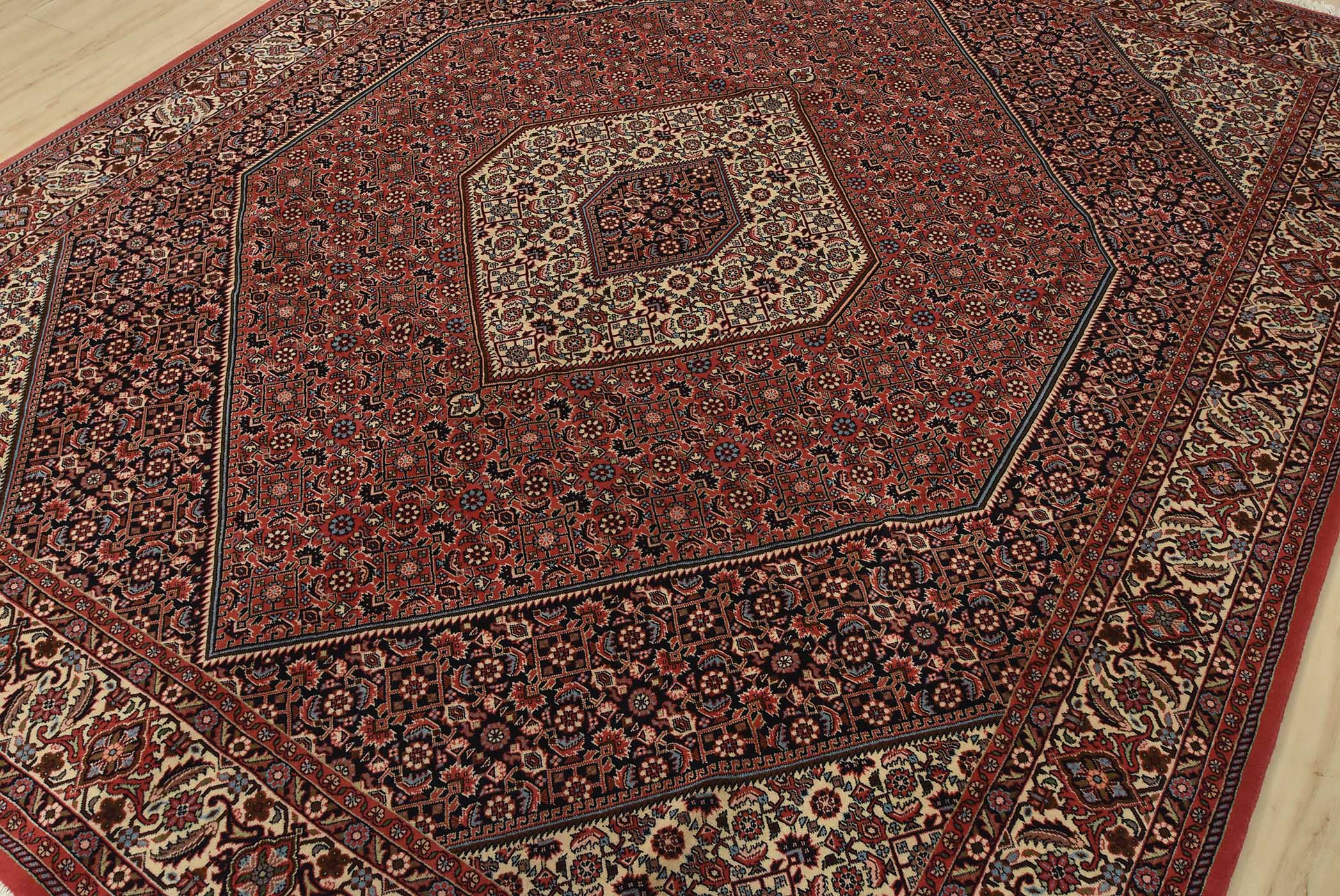 An authentic vintage traditional Bidjar rug hand-knotted with fine wool and natural dyes. This intricately woven rug features a geometric central medallion surrounded by a Herati pattern set against a red background. It has a full wool pile with no worn areas and is in very good condition.