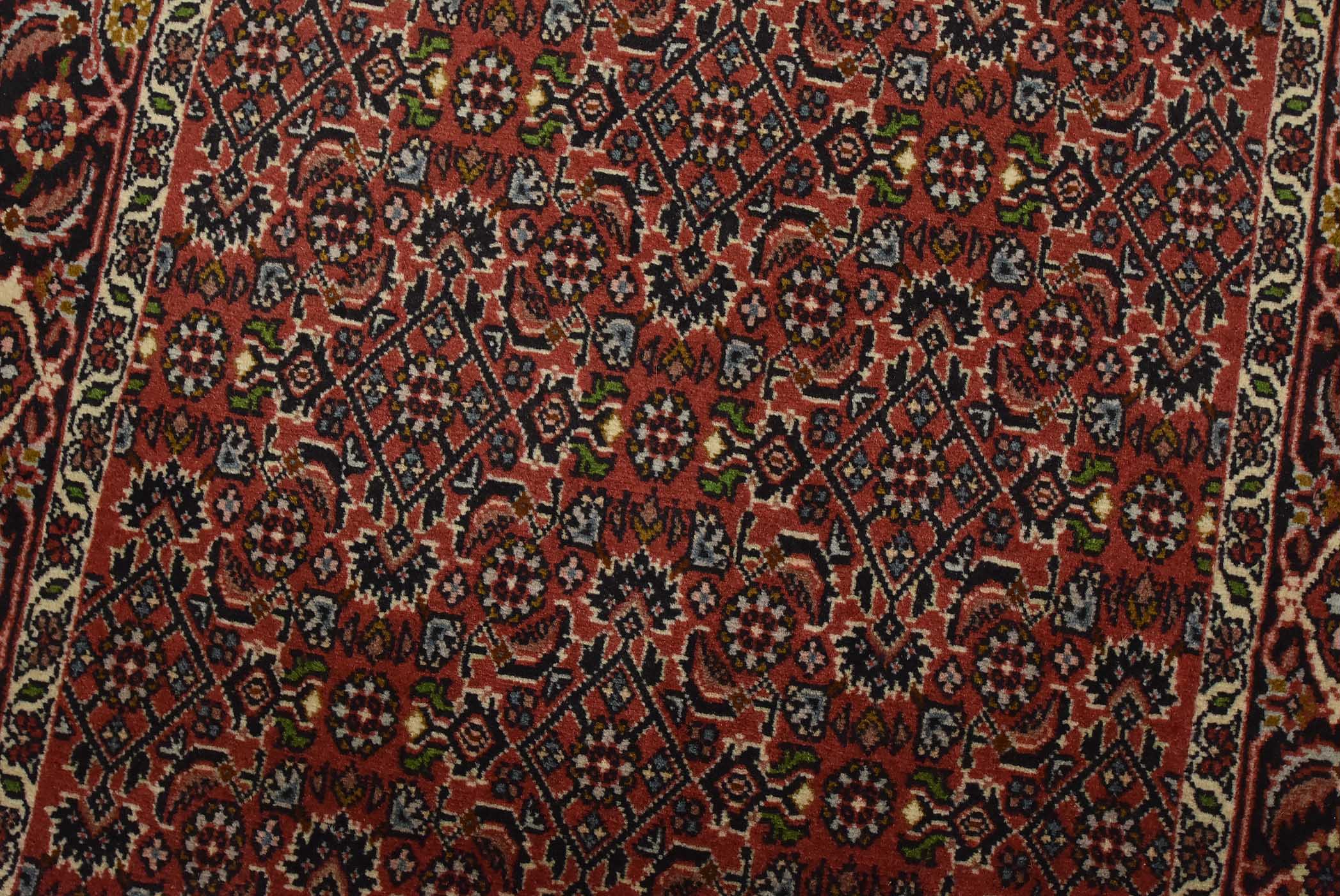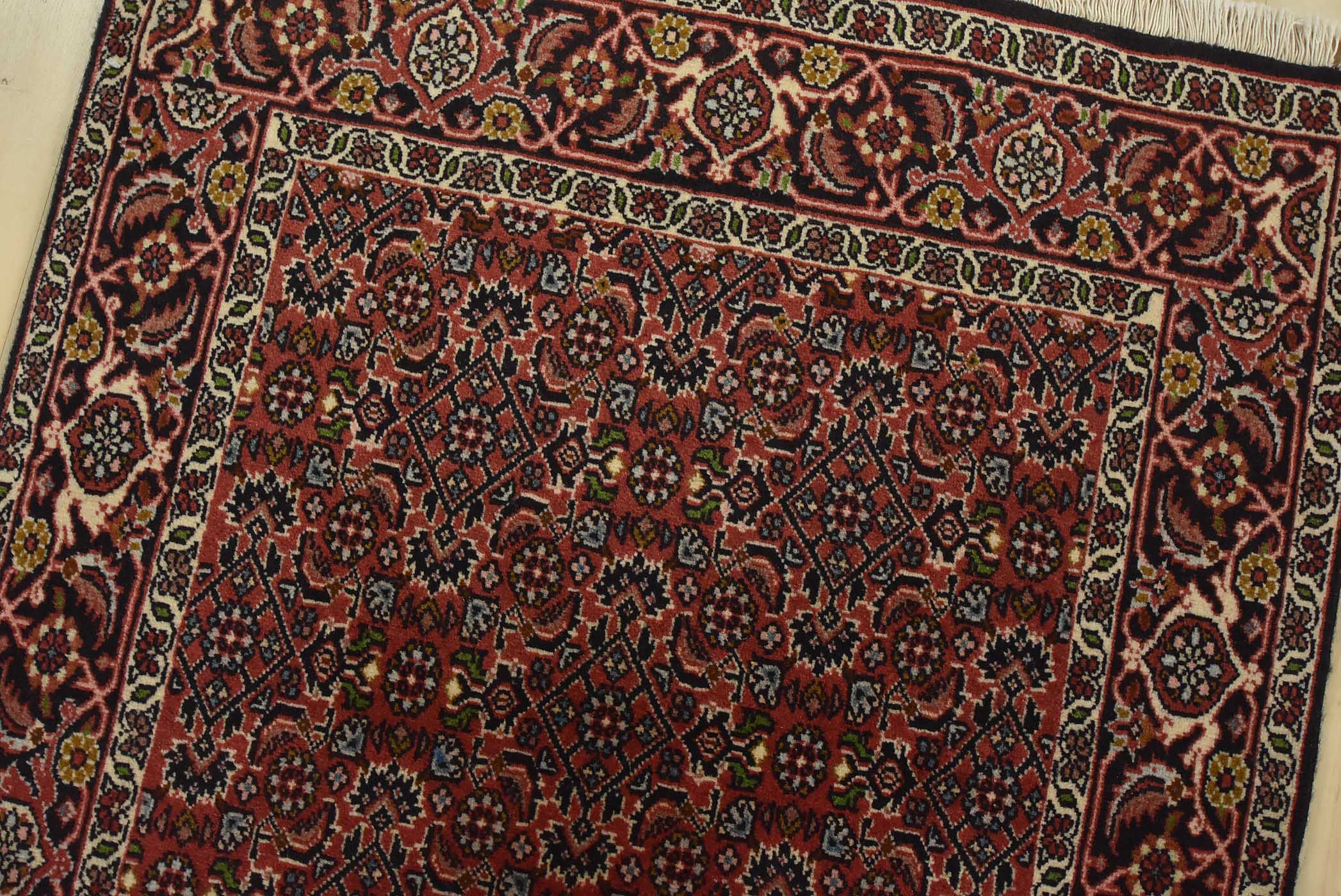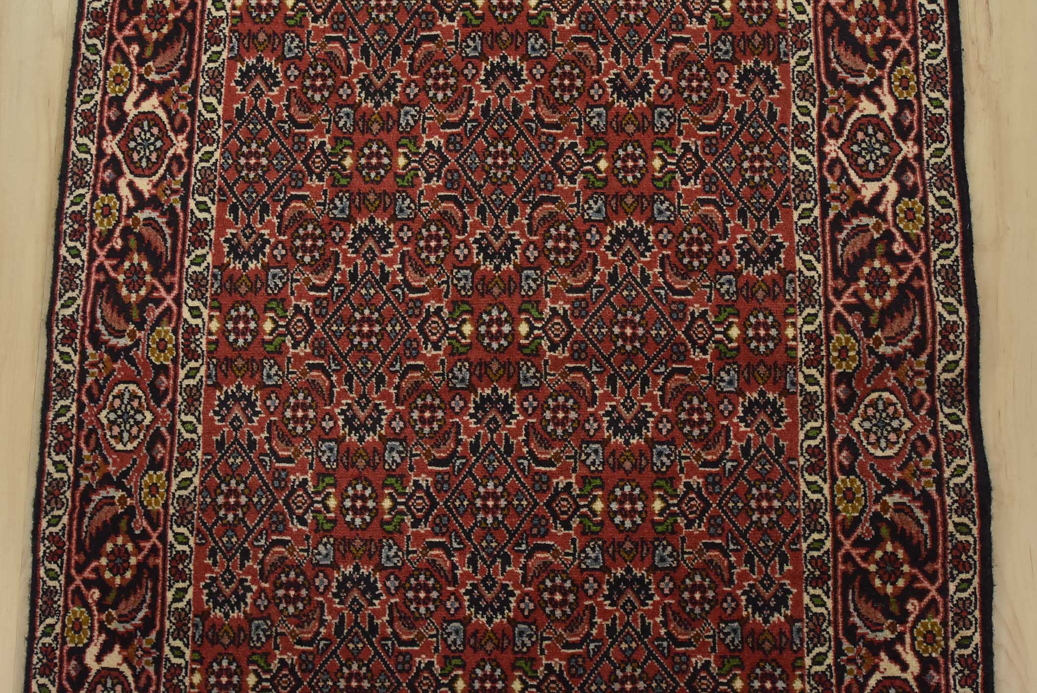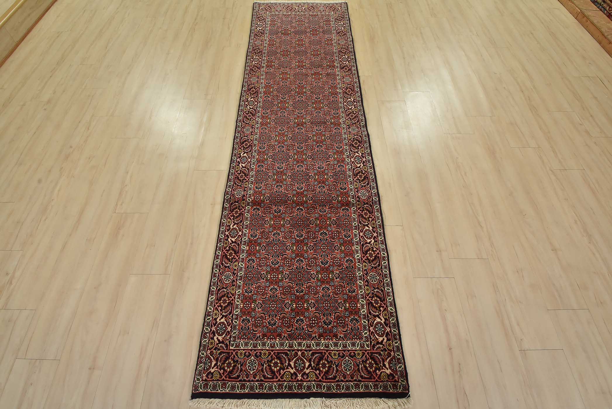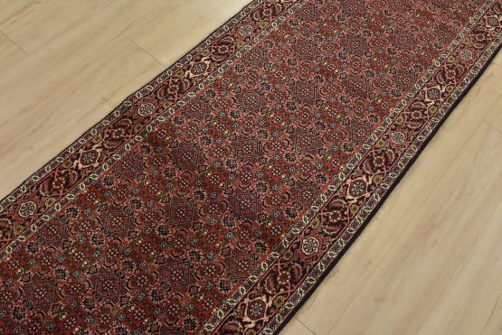 An authentic vintage traditional Bidjar runner hand-knotted with fine wool and natural dyes. This intricately woven oriental rug features a Herati pattern set against a red background. It has a full wool pile with no worn areas and is in very good condition.