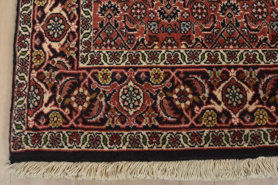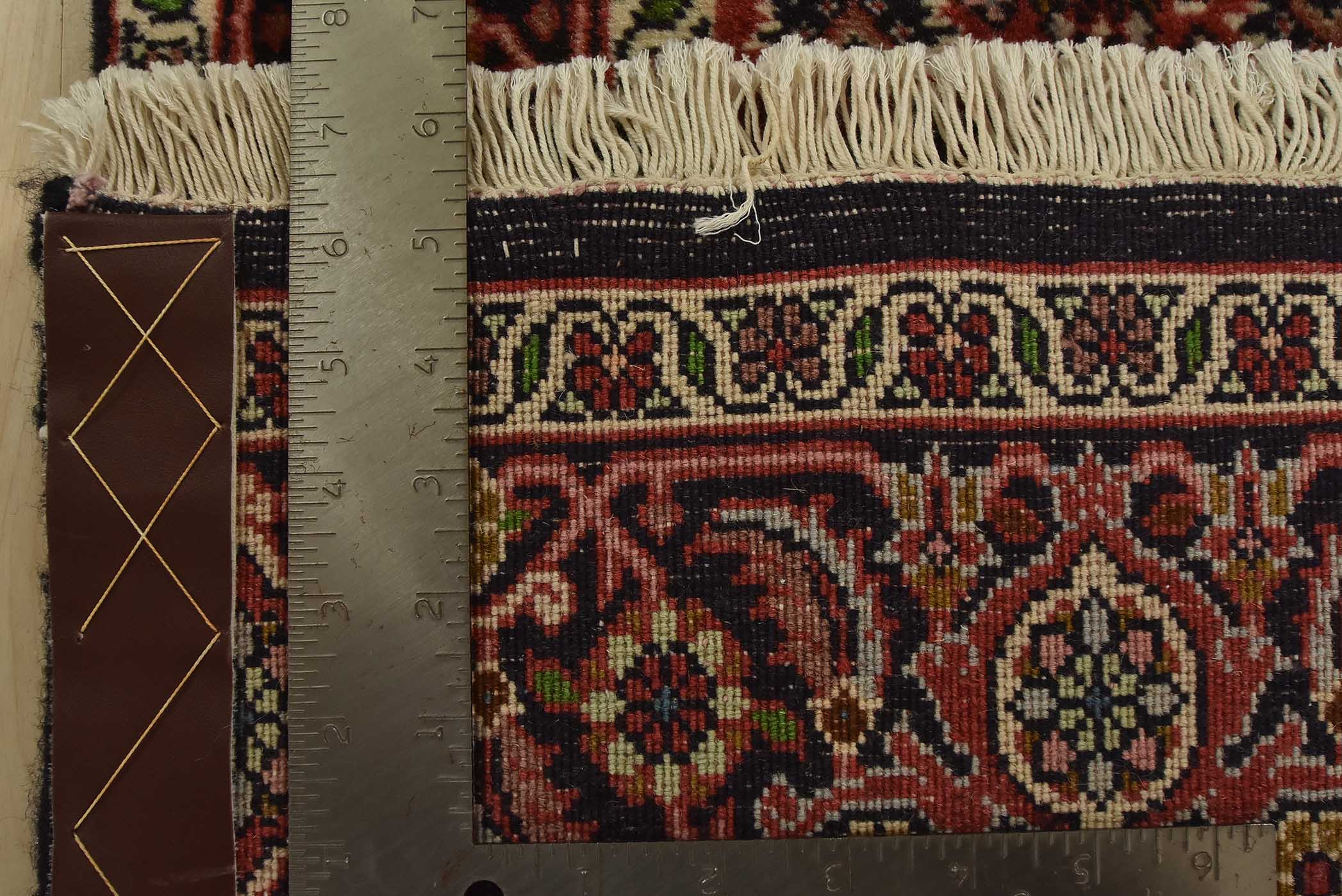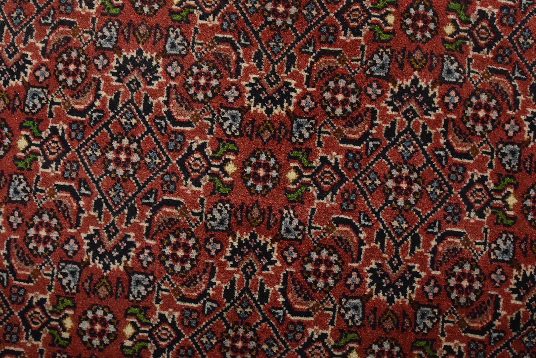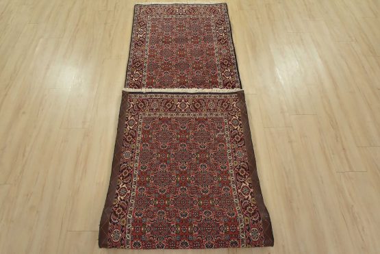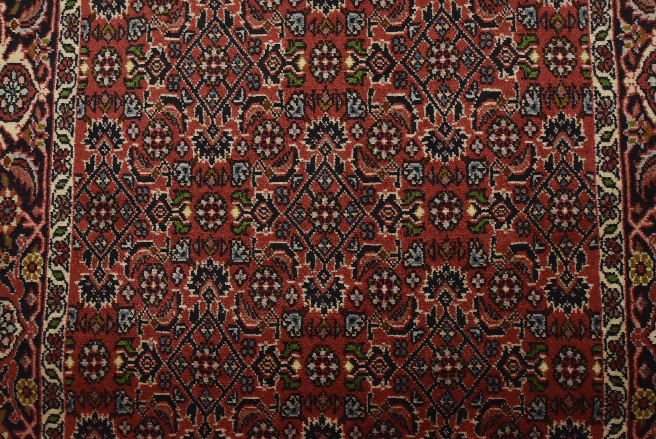 An authentic vintage traditional Bidjar runner hand-knotted with fine wool and natural dyes. This intricately woven oriental rug features a Herati pattern set against a red background. It has a full wool pile with no worn areas and is in very good condition.